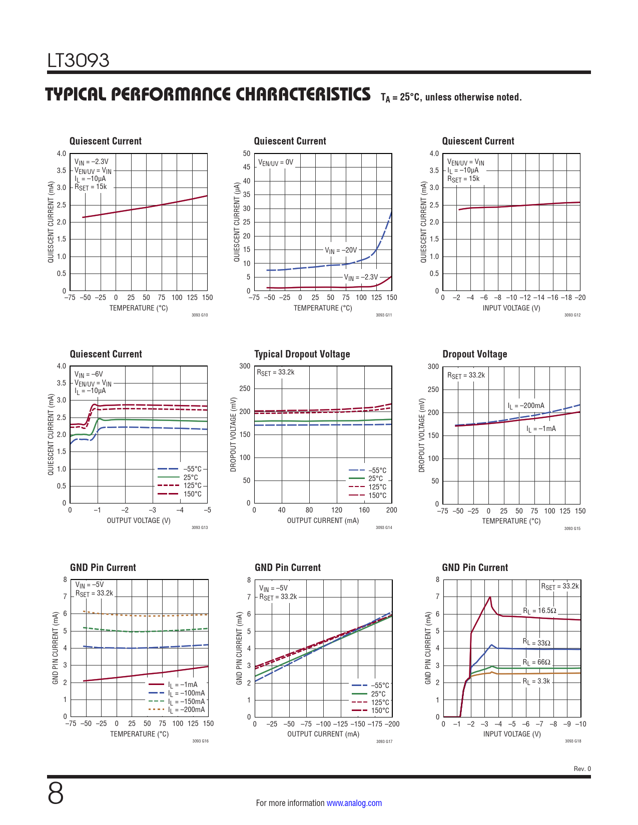 8 8 8 VIN = –5V V RSET = 33.2k R IN = –5V SET = 33.2k 7 7 RSET = 33.2k 7 6 6 RL = 16.5Ω 6 5 5 5 RL = 33Ω 4 4 4 3 3 RL = 66Ω 3 GND PIN CURRENT (mA) 2 I GND PIN CURRENT (mA) GND PIN CURRENT (mA) 2 R L = –1mA 2 –55°C L = 3.3k IL = –100mA 25°C 1 IL = –150mA 1 125°C 1 IL = –200mA 150°C 0 0 0 –75 –50 –25 0 25 50 75 100 125 150 0 –25 –50 –75 –100 –125 –150 –175 –200 0 –1 –2 –3 –4 –5 –6 –7 –8 –9 –10 TEMPERATURE (°C) OUTPUT CURRENT (mA) INPUT VOLTAGE (V) 3093 G16 3093 G17 3093 G18 Rev. 0 8 For more information www.analog.com Document Outline Features Applications Typical Application Description Absolute Maximum Ratings Pin Configuration Order Information Electrical Characteristics Typical Performance Characteristics Pin Functions Block Diagram Applications Information Typical Application Package Description Typical Application Related Parts