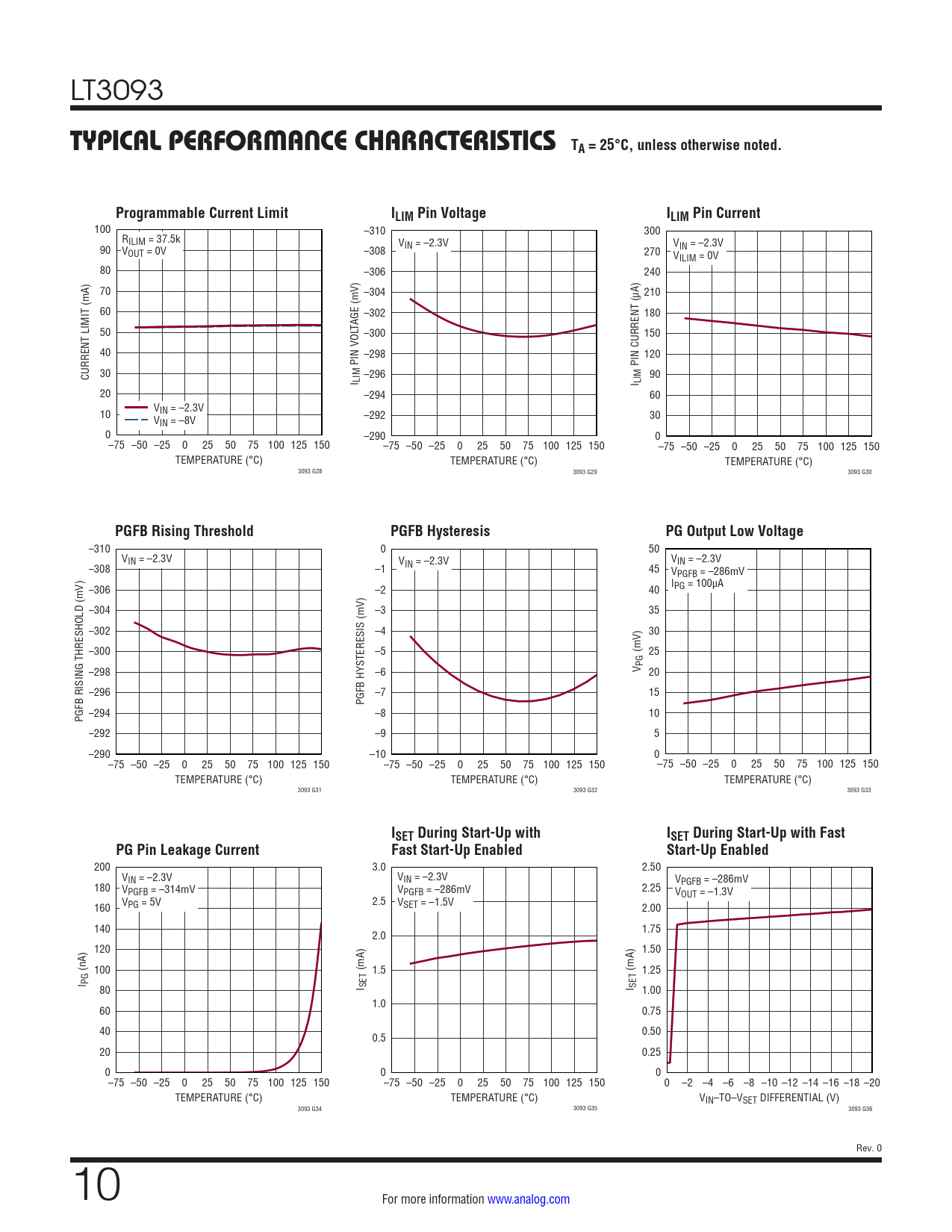 –310 0 50 VIN = –2.3V V VIN = –2.3V –308 IN = –2.3V –1 45 VPGFB = –286mV –306 –2 IPG = 100µA 40 –304 –3 35 –302 –4 30 –300 –5 (mV) 25 –298 –6 V PG 20 –296 –7 15 PGFB HYSTERESIS (mV) –294 PGFB RISING THRESHOLD (mV) –8 10 –292 –9 5 –290 –10 0 –75 –50 –25 0 25 50 75 100 125 150 –75 –50 –25 0 25 50 75 100 125 150 –75 –50 –25 0 25 50 75 100 125 150 TEMPERATURE (°C) TEMPERATURE (°C) TEMPERATURE (°C) 3093 G31 3093 G32 3093 G33
