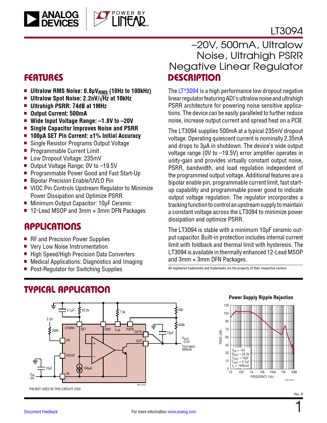 LT3094 –20V, 500mA, Ultralow Noise, Ultrahigh PSRR Negative Linear Regulator