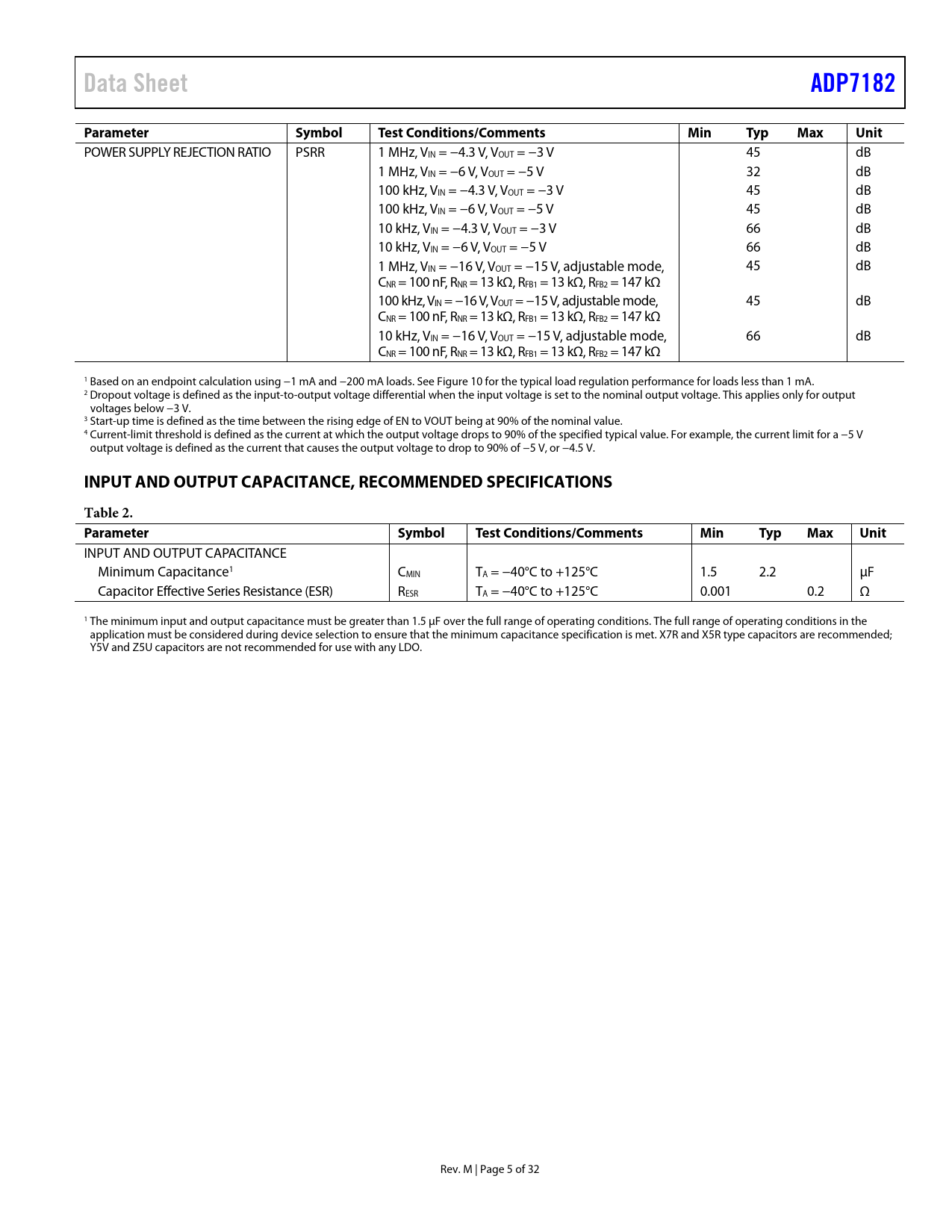link to page 10 Data SheetADP7182ParameterSymbolTest Conditions/CommentsMinTypMaxUnit POWER SUPPLY REJECTION RATIO PSRR 1 MHz, VIN = −4.3 V, VOUT = −3 V 45 dB 1 MHz, VIN = −6 V, VOUT = −5 V 32 dB 100 kHz, VIN = −4.3 V, VOUT = −3 V 45 dB 100 kHz, VIN = −6 V, VOUT = −5 V 45 dB 10 kHz, VIN = −4.3 V, VOUT = −3 V 66 dB 10 kHz, VIN = −6 V, VOUT = −5 V 66 dB 1 MHz, VIN = −16 V, VOUT = −15 V, adjustable mode, 45 dB CNR = 100 nF, RNR = 13 kΩ, RFB1 = 13 kΩ, RFB2 = 147 kΩ 100 kHz, VIN = −16 V, VOUT = −15 V, adjustable mode, 45 dB CNR = 100 nF, RNR = 13 kΩ, RFB1 = 13 kΩ, RFB2 = 147 kΩ 10 kHz, VIN = −16 V, VOUT = −15 V, adjustable mode, 66 dB CNR = 100 nF, RNR = 13 kΩ, RFB1 = 13 kΩ, RFB2 = 147 kΩ 1 Based on an endpoint calculation using −1 mA and −200 mA loads. See Figure 10 for the typical load regulation performance for loads less than 1 mA. 2 Dropout voltage is defined as the input-to-output voltage differential when the input voltage is set to the nominal output voltage. This applies only for output voltages below −3 V. 3 Start-up time is defined as the time between the rising edge of EN to VOUT being at 90% of the nominal value. 4 Current-limit threshold is defined as the current at which the output voltage drops to 90% of the specified typical value. For example, the current limit for a −5 V output voltage is defined as the current that causes the output voltage to drop to 90% of −5 V, or −4.5 V. INPUT AND OUTPUT CAPACITANCE, RECOMMENDED SPECIFICATIONSTable 2. ParameterSymbolTest Conditions/CommentsMinTypMaxUnit INPUT AND OUTPUT CAPACITANCE Minimum Capacitance1 CMIN TA = −40°C to +125°C 1.5 2.2 μF Capacitor Effective Series Resistance (ESR) RESR TA = −40°C to +125°C 0.001 0.2 Ω 1 The minimum input and output capacitance must be greater than 1.5 μF over the full range of operating conditions. The full range of operating conditions in the application must be considered during device selection to ensure that the minimum capacitance specification is met. X7R and X5R type capacitors are recommended; Y5V and Z5U capacitors are not recommended for use with any LDO. Rev. M | Page 5 of 32 Document Outline FEATURES APPLICATIONS TYPICAL APPLICATION CIRCUITS GENERAL DESCRIPTION TABLE OF CONTENTS REVISION HISTORY SPECIFICATIONS INPUT AND OUTPUT CAPACITANCE, RECOMMENDED SPECIFICATIONS ABSOLUTE MAXIMUM RATINGS THERMAL DATA THERMAL RESISTANCE ESD CAUTION PIN CONFIGURATIONS AND FUNCTION DESCRIPTIONS TYPICAL PERFORMANCE CHARACTERISTICS THEORY OF OPERATION ADJUSTABLE MODE OPERATION APPLICATIONS INFORMATION ADIsimPower DESIGN TOOL CAPACITOR SELECTION Output Capacitor Input Bypass Capacitor Input and Output Capacitor Properties ENABLE PIN OPERATION SOFT START NOISE REDUCTION OF THE ADJUSTABLE ADP7182 CURRENT-LIMIT AND THERMAL OVERLOAD PROTECTION THERMAL CONSIDERATIONS Thermal Characterization Parameter, ΨJB PCB LAYOUT CONSIDERATIONS OUTLINE DIMENSIONS ORDERING GUIDE