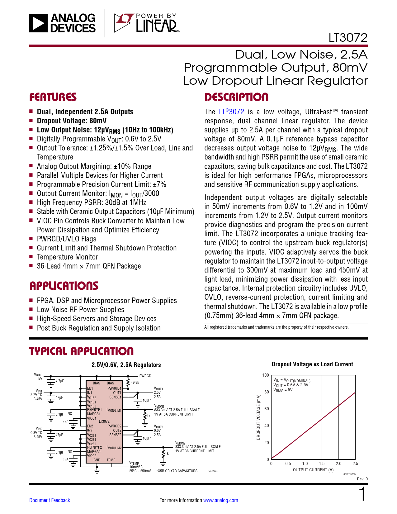 capacitance. Internal protection circuitry includes UVLO, n OVLO, reverse-current protection, current limiting and FPGA, DSP and Microprocessor Power Supplies n thermal shutdown. The LT3072 is available in a low profile Low Noise RF Power Supplies n (0.75mm) 36-lead 4mm × 7mm QFN package. High-Speed Servers and Storage Devices n All registered trademarks and trademarks are the property of their respective owners. Post Buck Regulation and Supply Isolation