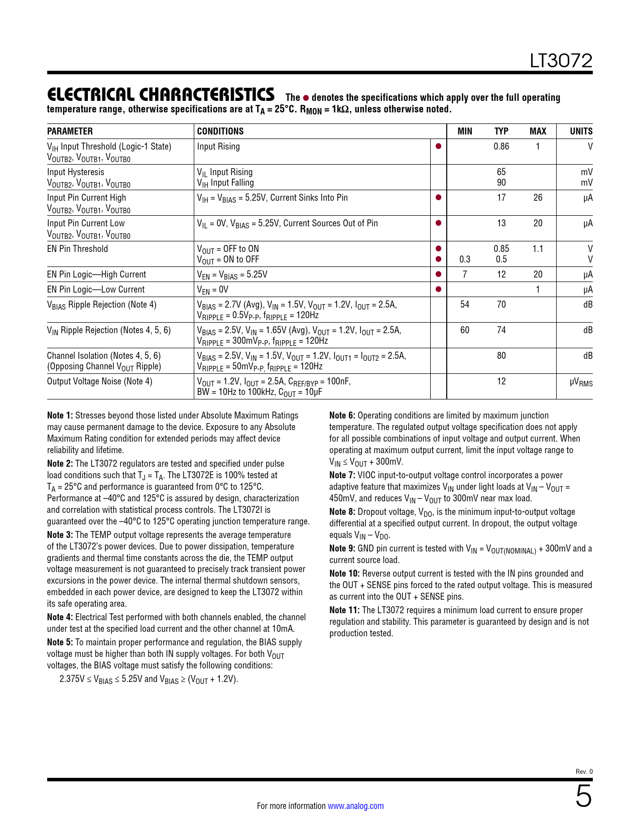 link to page 2 LT3072 ELECTRICAL CHARACTERISTICSThe l denotes the specifications which apply over the full operatingtemperature range, otherwise specifications are at TA = 25°C. RMON = 1kΩ, unless otherwise noted.PARAMETERCONDITIONSMINTYPMAXUNITS VIH Input Threshold (Logic-1 State) Input Rising l 0.86 1 V VOUTB2, VOUTB1, VOUTB0 Input Hysteresis VIL Input Rising 65 mV VOUTB2, VOUTB1, VOUTB0 VIH Input Falling 90 mV Input Pin Current High VIH = VBIAS = 5.25V, Current Sinks Into Pin l 17 26 µA VOUTB2, VOUTB1, VOUTB0 Input Pin Current Low VIL = 0V, VBIAS = 5.25V, Current Sources Out of Pin l 13 20 µA VOUTB2, VOUTB1, VOUTB0 EN Pin Threshold VOUT = OFF to ON l 0.85 1.1 V VOUT = ON to OFF l 0.3 0.5 V EN Pin Logic—High Current VEN = VBIAS = 5.25V l 7 12 20 µA EN Pin Logic—Low Current VEN = 0V l 1 µA VBIAS Ripple Rejection (Note 4) VBIAS = 2.7V (Avg), VIN = 1.5V, VOUT = 1.2V, IOUT = 2.5A, 54 70 dB VRIPPLE = 0.5VP-P, fRIPPLE = 120Hz VIN Ripple Rejection (Notes 4, 5, 6) VBIAS = 2.5V, VIN = 1.65V (Avg), VOUT = 1.2V, IOUT = 2.5A, 60 74 dB VRIPPLE = 300mVP-P, fRIPPLE = 120Hz Channel Isolation (Notes 4, 5, 6) VBIAS = 2.5V, VIN = 1.5V, VOUT = 1.2V, IOUT1 = IOUT2 = 2.5A, 80 dB (Opposing Channel VOUT Ripple) VRIPPLE = 50mVP-P, fRIPPLE = 120Hz Output Voltage Noise (Note 4) VOUT = 1.2V, IOUT = 2.5A, CREF/BYP = 100nF, 12 µVRMS BW = 10Hz to 100kHz, COUT = 10µF Note 1: Stresses beyond those listed under Absolute Maximum Ratings Note 6: Operating conditions are limited by maximum junction may cause permanent damage to the device. Exposure to any Absolute temperature. The regulated output voltage specification does not apply Maximum Rating condition for extended periods may affect device for all possible combinations of input voltage and output current. When reliability and lifetime. operating at maximum output current, limit the input voltage range to Note 2: The LT3072 regulators are tested and specified under pulse VIN ≤ VOUT + 300mV. load conditions such that TJ = TA. The LT3072E is 100% tested at Note 7: VIOC input-to-output voltage control incorporates a power TA = 25°C and performance is guaranteed from 0°C to 125°C. adaptive feature that maximizes VIN under light loads at VIN – VOUT = Performance at –40°C and 125°C is assured by design, characterization 450mV, and reduces VIN – VOUT to 300mV near max load. and correlation with statistical process controls. The LT3072I is Note 8: Dropout voltage, VDO, is the minimum input-to-output voltage guaranteed over the –40°C to 125°C operating junction temperature range. differential at a specified output current. In dropout, the output voltage Note 3: The TEMP output voltage represents the average temperature equals VIN – VDO. of the LT3072’s power devices. Due to power dissipation, temperature Note 9: GND pin current is tested with VIN = VOUT(NOMINAL) + 300mV and a gradients and thermal time constants across the die, the TEMP output current source load. voltage measurement is not guaranteed to precisely track transient power Note 10: Reverse output current is tested with the IN pins grounded and excursions in the power device. The internal thermal shutdown sensors, the OUT + SENSE pins forced to the rated output voltage. This is measured embedded in each power device, are designed to keep the LT3072 within as current into the OUT + SENSE pins. its safe operating area. Note 11: The LT3072 requires a minimum load current to ensure proper Note 4: Electrical Test performed with both channels enabled, the channel regulation and stability. This parameter is guaranteed by design and is not under test at the specified load current and the other channel at 10mA. production tested. Note 5: To maintain proper performance and regulation, the BIAS supply voltage must be higher than both IN supply voltages. For both VOUT voltages, the BIAS voltage must satisfy the following conditions: 2.375V ≤ VBIAS ≤ 5.25V and VBIAS ≥ (VOUT + 1.2V). Rev. 0 For more information www.analog.com 5 Document Outline Features Applications Typical Application Description Absolute Maximum Ratings Pin Configuration Order Information Electrical Characteristics Typical Performance Characteristics Pin Functions Block Diagram Applications Information Typical Applications Package Description Typical Application Related Parts