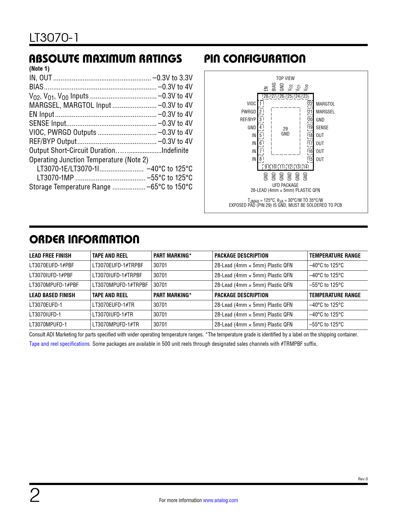 LT3070-1 ABSOLUTE MAXIMUM RATINGSPIN CONFIGURATION(Note 1) IN, OUT ... –0.3V to 3.3V TOP VIEW BIAS ... –0.3V to 4V EN BIAS GND V O2 V O1 V O0 VO2, VO1, VO0 Inputs .. –0.3V to 4V 28 27 26 25 24 23 MARGSEL, MARGTOL Input .. –0.3V to 4V VIOC 1 22 MARGTOL EN Input ... –0.3V to 4V PWRGD 2 21 MARGSEL SENSE Input ... –0.3V to 4V REF/BYP 3 20 GND VIOC, PWRGD Outputs .. –0.3V to 4V GND 4 29 19 SENSE GND IN 5 18 OUT REF/BYP Output ... –0.3V to 4V IN 6 17 OUT Output Short-Circuit Duration……...Indefinite IN 7 16 OUT Operating Junction Temperature (Note 2) IN 8 15 OUT LT3070-1E/LT3070-1I .. –40°C to 125°C 9 10 11 12 13 14 LT3070-1MP .. –55°C to 125°C GND GND GND GND GND GND Storage Temperature Range .. –65°C to 150°C UFD PACKAGE 28-LEAD (4mm × 5mm) PLASTIC QFN TJMAX = 125°C, θJA = 30°C/W TO 35°C/W EXPOSED PAD (PIN 29) IS GND, MUST BE SOLDERED TO PCB ORDER INFORMATION LEAD FREE FINISHTAPE AND REELPART MARKING*PACKAGE DESCRIPTIONTEMPERATURE RANGE LT3070EUFD-1#PBF LT3070EUFD-1#TRPBF 30701 28-Lead (4mm × 5mm) Plastic QFN –40°C to 125°C LT3070IUFD-1#PBF LT3070IUFD-1#TRPBF 30701 28-Lead (4mm × 5mm) Plastic QFN –40°C to 125°C LT3070MPUFD-1#PBF LT3070MPUFD-1#TRPBF 30701 28-Lead (4mm × 5mm) Plastic QFN –55°C to 125°C LEAD BASED FINISHTAPE AND REELPART MARKING*PACKAGE DESCRIPTIONTEMPERATURE RANGE LT3070EUFD-1 LT3070EUFD-1#TR 30701 28-Lead (4mm × 5mm) Plastic QFN –40°C to 125°C LT3070IUFD-1 LT3070IUFD-1#TR 30701 28-Lead (4mm × 5mm) Plastic QFN –40°C to 125°C LT3070MPUFD-1 LT3070MPUFD-1#TR 30701 28-Lead (4mm × 5mm) Plastic QFN –55°C to 125°C Consult ADI Marketing for parts specified with wider operating temperature ranges. *The temperature grade is identified by a label on the shipping container. Tape and reel specifications. Some packages are available in 500 unit reels through designated sales channels with #TRMPBF suffix. Rev 0 2 For more information www.analog.com Document Outline Features Applications Description Typical Application Absolute Maximum Ratings Pin Configuration Order Information Electrical Characteristics Typical Performance Characteristics Pin Functions Block Diagram Applications Information Package Description Typical Application Related Parts