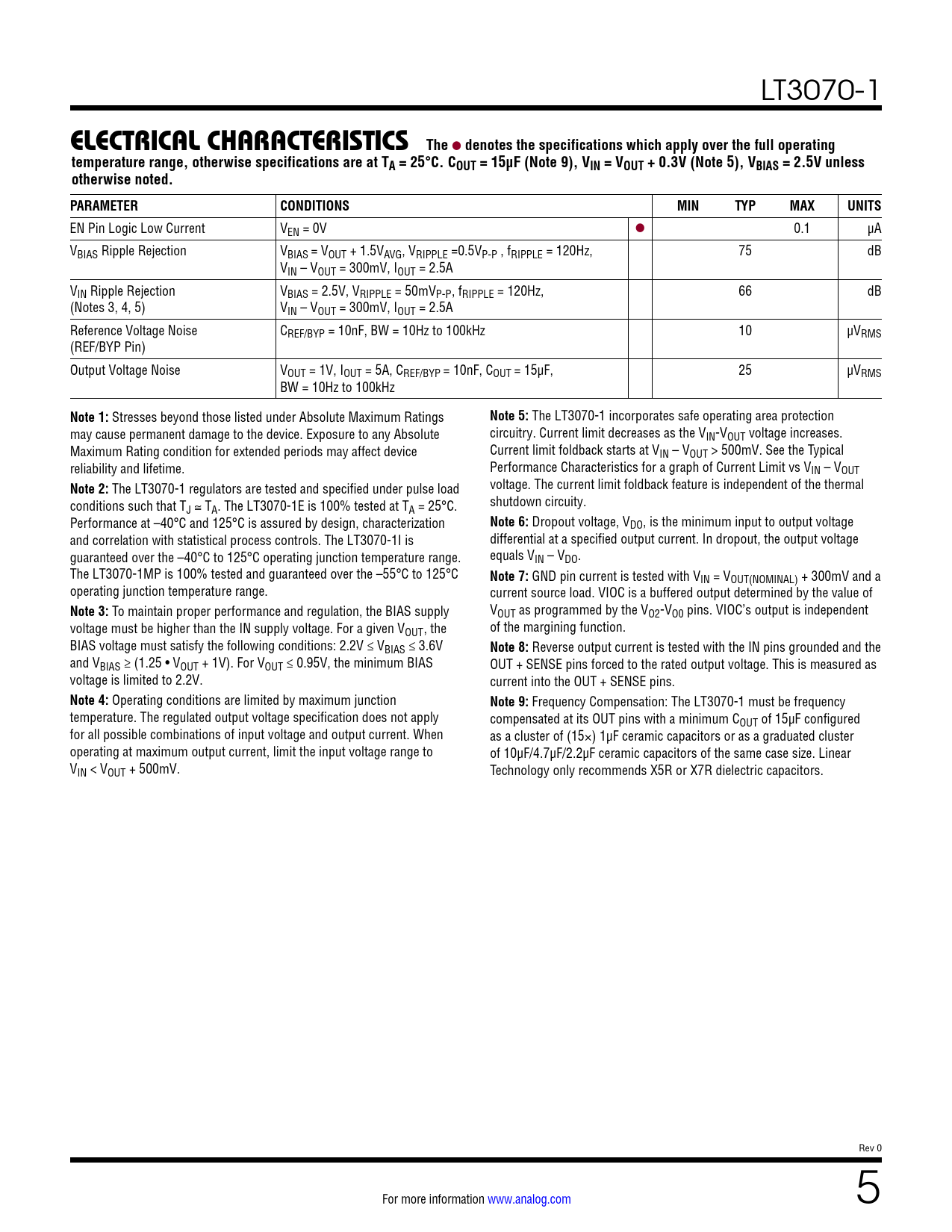 link to page 6 link to page 6 LT3070-1 ELECTRICAL CHARACTERISTICSThe l denotes the specifications which apply over the full operatingtemperature range, otherwise specifications are at TA = 25°C. COUT = 15µF (Note 9), VIN = VOUT + 0.3V (Note 5), VBIAS = 2.5V unlessotherwise noted.PARAMETERCONDITIONSMINTYPMAXUNITS EN Pin Logic Low Current VEN = 0V l 0.1 µA VBIAS Ripple Rejection VBIAS = VOUT + 1.5VAVG, VRIPPLE =0.5VP-P , fRIPPLE = 120Hz, 75 dB VIN – VOUT = 300mV, IOUT = 2.5A VIN Ripple Rejection VBIAS = 2.5V, VRIPPLE = 50mVP-P , fRIPPLE = 120Hz, 66 dB (Notes 3, 4, 5) VIN – VOUT = 300mV, IOUT = 2.5A Reference Voltage Noise CREF/BYP = 10nF, BW = 10Hz to 100kHz 10 µVRMS (REF/BYP Pin) Output Voltage Noise VOUT = 1V, IOUT = 5A, CREF/BYP = 10nF, COUT = 15µF, 25 µVRMS BW = 10Hz to 100kHz Note 1: Stresses beyond those listed under Absolute Maximum Ratings Note 5: The LT3070-1 incorporates safe operating area protection may cause permanent damage to the device. Exposure to any Absolute circuitry. Current limit decreases as the VIN-VOUT voltage increases. Maximum Rating condition for extended periods may affect device Current limit foldback starts at VIN – VOUT > 500mV. See the Typical reliability and lifetime. Performance Characteristics for a graph of Current Limit vs VIN – VOUT Note 2: The LT3070-1 regulators are tested and specified under pulse load voltage. The current limit foldback feature is independent of the thermal conditions such that T shutdown circuity. J ≅ TA. The LT3070-1E is 100% tested at TA = 25°C. Performance at –40°C and 125°C is assured by design, characterization Note 6: Dropout voltage, VDO, is the minimum input to output voltage and correlation with statistical process controls. The LT3070-1I is differential at a specified output current. In dropout, the output voltage guaranteed over the –40°C to 125°C operating junction temperature range. equals VIN – VDO. The LT3070-1MP is 100% tested and guaranteed over the –55°C to 125°C Note 7: GND pin current is tested with VIN = VOUT(NOMINAL) + 300mV and a operating junction temperature range. current source load. VIOC is a buffered output determined by the value of Note 3: To maintain proper performance and regulation, the BIAS supply VOUT as programmed by the VO2-VO0 pins. VIOC’s output is independent voltage must be higher than the IN supply voltage. For a given VOUT , the of the margining function. BIAS voltage must satisfy the following conditions: 2.2V ≤ VBIAS ≤ 3.6V Note 8: Reverse output current is tested with the IN pins grounded and the and VBIAS ≥ (1.25 • VOUT + 1V). For VOUT ≤ 0.95V, the minimum BIAS OUT + SENSE pins forced to the rated output voltage. This is measured as voltage is limited to 2.2V. current into the OUT + SENSE pins. Note 4: Operating conditions are limited by maximum junction Note 9: Frequency Compensation: The LT3070-1 must be frequency temperature. The regulated output voltage specification does not apply compensated at its OUT pins with a minimum COUT of 15µF configured for all possible combinations of input voltage and output current. When as a cluster of (15×) 1µF ceramic capacitors or as a graduated cluster operating at maximum output current, limit the input voltage range to of 10µF/4.7µF/2.2µF ceramic capacitors of the same case size. Linear VIN < VOUT + 500mV. Technology only recommends X5R or X7R dielectric capacitors. Rev 0 For more information www.analog.com 5 Document Outline Features Applications Description Typical Application Absolute Maximum Ratings Pin Configuration Order Information Electrical Characteristics Typical Performance Characteristics Pin Functions Block Diagram Applications Information Package Description Typical Application Related Parts