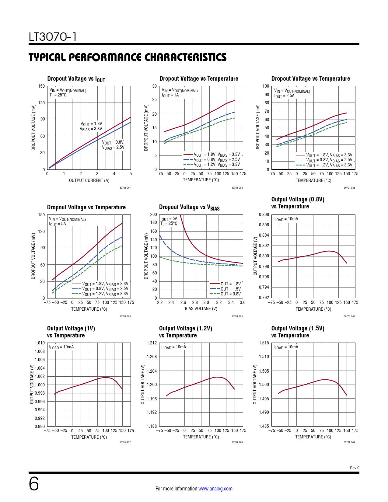 150 200 0.808 VIN = VOUT(NOMINAL) IOUT = 5A ILOAD = 10mA I 180 OUT = 5A TJ = 25°C 0.806 120 160 0.804 140 0.802 90 120 TAGE (V) 100 0.800 60 80 0.798 60 OUTPUT VOL DROPOUT VOLTAGE (mV) DROPOUT VOLTAGE (mV) 0.796 30 40 VOUT = 1.8V, VBIAS = 3.3V OUT = 1.8V 0.794 VOUT = 0.8V, VBIAS = 2.5V 20 OUT = 1.5V VOUT = 1.2V, VBIAS = 3.3V OUT = 0.8V 0 0 0.792 –75 –50 –25 0 25 50 75 100 125 150 175 2.2 2.4 2.6 2.8 3.0 3.2 3.4 3.6 –75 –50 –25 0 25 50 75 100 125 150 175 TEMPERATURE (°C) BIAS VOLTAGE (V) TEMPERATURE (°C) 30701 G04 30701 G05 30701 G06