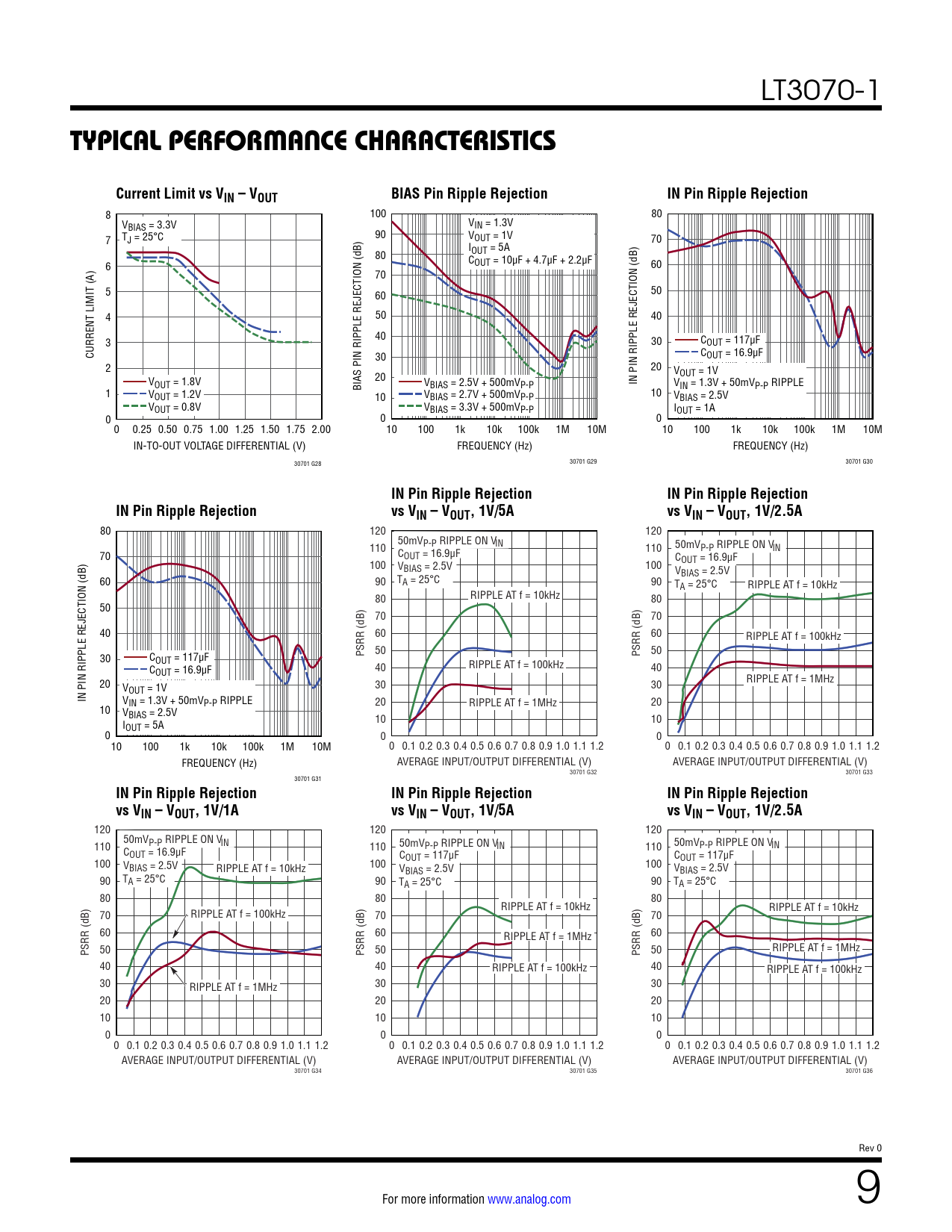 8 100 80 VBIAS = 3.3V VIN = 1.3V 7 T 90 J = 25°C VOUT = 1V 70 I 80 OUT = 5A 6 COUT = 10µF + 4.7µF + 2.2µF 60 70 5 60 50 4 50 40 3 40 30 COUT = 117µF CURRENT LIMIT (A) 30 COUT = 16.9µF 2 20 VOUT = 1V V 20 OUT = 1.8V BIAS PIN RIPPLE REJECTION (dB) VBIAS = 2.5V + 500mVP-P IN PIN RIPPLE REJECTION (dB) VIN = 1.3V + 50mVP-P RIPPLE 1 VOUT = 1.2V 10 VBIAS = 2.7V + 500mVP-P 10 VBIAS = 2.5V VOUT = 0.8V VBIAS = 3.3V + 500mVP-P IOUT = 1A 0 0 0 0 0.25 0.50 0.75 1.00 1.25 1.50 1.75 2.00 10 100 1k 10k 100k 1M 10M 10 100 1k 10k 100k 1M 10M IN-TO-OUT VOLTAGE DIFFERENTIAL (V) FREQUENCY (Hz) FREQUENCY (Hz) 30701 G28 30701 G29 30701 G30