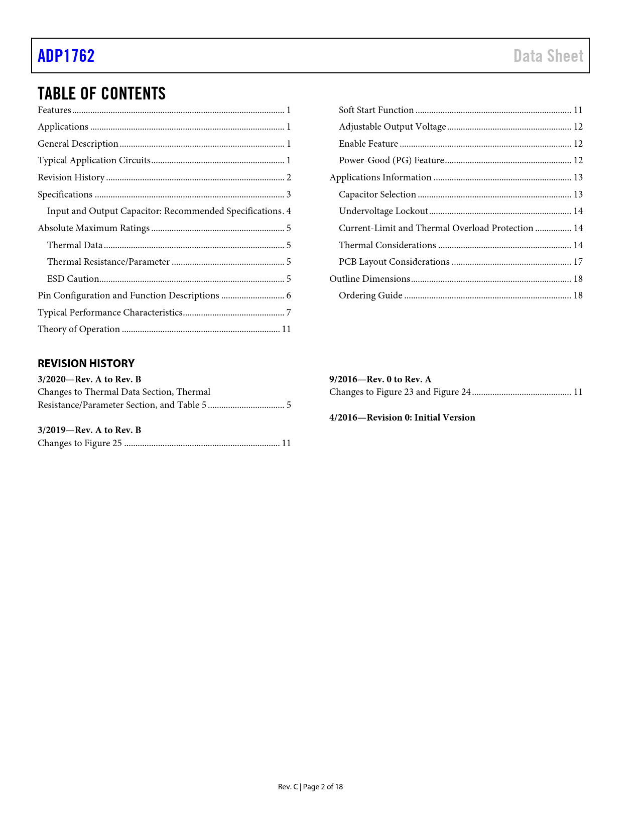 link to page 1 link to page 1 link to page 1 link to page 1 link to page 2 link to page 3 link to page 4 link to page 5 link to page 5 link to page 5 link to page 5 link to page 6 link to page 7 link to page 11 link to page 11 link to page 12 link to page 12 link to page 12 link to page 13 link to page 13 link to page 14 link to page 14 link to page 14 link to page 17 link to page 18 link to page 18 ADP1762Data SheetTABLE OF CONTENTS Features .. 1 Soft Start Function ... 11 Applications .. 1 Adjustable Output Voltage ... 12 General Description ... 1 Enable Feature .. 12 Typical Application Circuits ... 1 Power-Good (PG) Feature .. 12 Revision History ... 2 Applications Information ... 13 Specifications .. 3 Capacitor Selection .. 13 Input and Output Capacitor: Recommended Specifications . 4 Undervoltage Lockout ... 14 Absolute Maximum Ratings ... 5 Current-Limit and Thermal Overload Protection .. 14 Thermal Data .. 5 Thermal Considerations ... 14 Thermal Resistance/Parameter .. 5 PCB Layout Considerations ... 17 ESD Caution.. 5 Outline Dimensions ... 18 Pin Configuration and Function Descriptions .. 6 Ordering Guide .. 18 Typical Performance Characteristics ... 7 Theory of Operation .. 11 REVISION HISTORY3/2020—Rev. A to Rev. B9/2016—Rev. 0 to Rev. A Changes to Thermal Data Section, Thermal Changes to Figure 23 and Figure 24 .. 11 Resistance/Parameter Section, and Table 5 .. 5 4/2016—Revision 0: Initial Version3/2019—Rev. A to Rev. B Changes to Figure 25 ... 11 Rev. C | Page 2 of 18 Document Outline Features Applications General Description Typical Application Circuits Revision History Specifications Input and Output Capacitor: Recommended Specifications Absolute Maximum Ratings Thermal Data Thermal Resistance/Parameter ESD Caution Pin Configuration and Function Descriptions Typical Performance Characteristics Theory of Operation Soft Start Function Adjustable Output Voltage Enable Feature Power-Good (PG) Feature Applications Information Capacitor Selection Output Capacitor Input Bypass Capacitor Input and Output Capacitor Properties Undervoltage Lockout Current-Limit and Thermal Overload Protection Thermal Considerations PCB Layout Considerations Outline Dimensions Ordering Guide