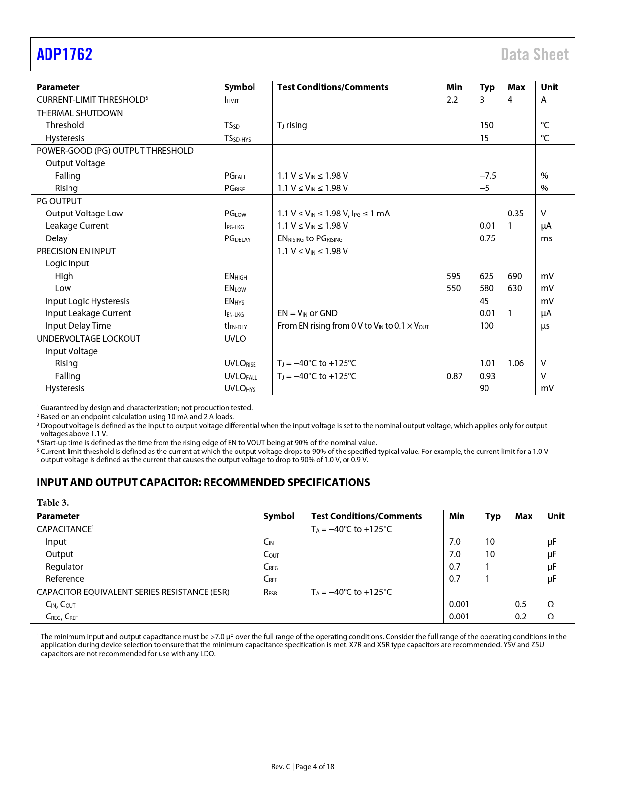 ADP1762Data SheetParameterSymbolTest Conditions/Comments MinTypMaxUnit CURRENT-LIMIT THRESHOLD5 ILIMIT 2.2 3 4 A THERMAL SHUTDOWN Threshold TSSD TJ rising 150 °C Hysteresis TSSD-HYS 15 °C POWER-GOOD (PG) OUTPUT THRESHOLD Output Voltage Falling PGFALL 1.1 V ≤ VIN ≤ 1.98 V −7.5 % Rising PGRISE 1.1 V ≤ VIN ≤ 1.98 V −5 % PG OUTPUT Output Voltage Low PGLOW 1.1 V ≤ VIN ≤ 1.98 V, IPG ≤ 1 mA 0.35 V Leakage Current IPG-LKG 1.1 V ≤ VIN ≤ 1.98 V 0.01 1 μA Delay1 PGDELAY ENRISING to PGRISING 0.75 ms PRECISION EN INPUT 1.1 V ≤ VIN ≤ 1.98 V Logic Input High ENHIGH 595 625 690 mV Low ENLOW 550 580 630 mV Input Logic Hysteresis ENHYS 45 mV Input Leakage Current IEN-LKG EN = VIN or GND 0.01 1 μA Input Delay Time tIEN-DLY From EN rising from 0 V to VIN to 0.1 × VOUT 100 μs UNDERVOLTAGE LOCKOUT UVLO Input Voltage Rising UVLORISE TJ = −40°C to +125°C 1.01 1.06 V Falling UVLOFALL TJ = −40°C to +125°C 0.87 0.93 V Hysteresis UVLOHYS 90 mV 1 Guaranteed by design and characterization; not production tested. 2 Based on an endpoint calculation using 10 mA and 2 A loads. 3 Dropout voltage is defined as the input to output voltage differential when the input voltage is set to the nominal output voltage, which applies only for output voltages above 1.1 V. 4 Start-up time is defined as the time from the rising edge of EN to VOUT being at 90% of the nominal value. 5 Current-limit threshold is defined as the current at which the output voltage drops to 90% of the specified typical value. For example, the current limit for a 1.0 V output voltage is defined as the current that causes the output voltage to drop to 90% of 1.0 V, or 0.9 V. INPUT AND OUTPUT CAPACITOR: RECOMMENDED SPECIFICATIONSTable 3. Parameter SymbolTestConditions/CommentsMinTypMaxUnit CAPACITANCE1 TA = −40°C to +125°C Input CIN 7.0 10 μF Output COUT 7.0 10 μF Regulator CREG 0.7 1 μF Reference CREF 0.7 1 μF CAPACITOR EQUIVALENT SERIES RESISTANCE (ESR) RESR TA = −40°C to +125°C CIN, COUT 0.001 0.5 Ω CREG, CREF 0.001 0.2 Ω 1 The minimum input and output capacitance must be >7.0 μF over the full range of the operating conditions. Consider the full range of the operating conditions in the application during device selection to ensure that the minimum capacitance specification is met. X7R and X5R type capacitors are recommended. Y5V and Z5U capacitors are not recommended for use with any LDO. Rev. C | Page 4 of 18 Document Outline Features Applications General Description Typical Application Circuits Revision History Specifications Input and Output Capacitor: Recommended Specifications Absolute Maximum Ratings Thermal Data Thermal Resistance/Parameter ESD Caution Pin Configuration and Function Descriptions Typical Performance Characteristics Theory of Operation Soft Start Function Adjustable Output Voltage Enable Feature Power-Good (PG) Feature Applications Information Capacitor Selection Output Capacitor Input Bypass Capacitor Input and Output Capacitor Properties Undervoltage Lockout Current-Limit and Thermal Overload Protection Thermal Considerations PCB Layout Considerations Outline Dimensions Ordering Guide