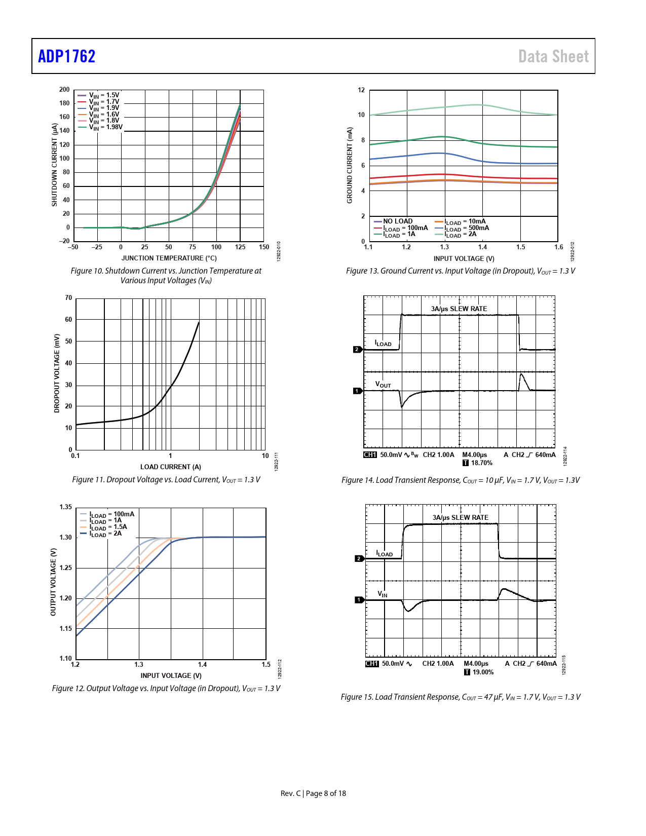 1292 129 Figure 11. Dropout Voltage vs. Load Current, VOUT = 1.3 V Figure 14. Load Transient Response, COUT = 10 μF, VIN = 1.7 V, VOUT = 1.3V