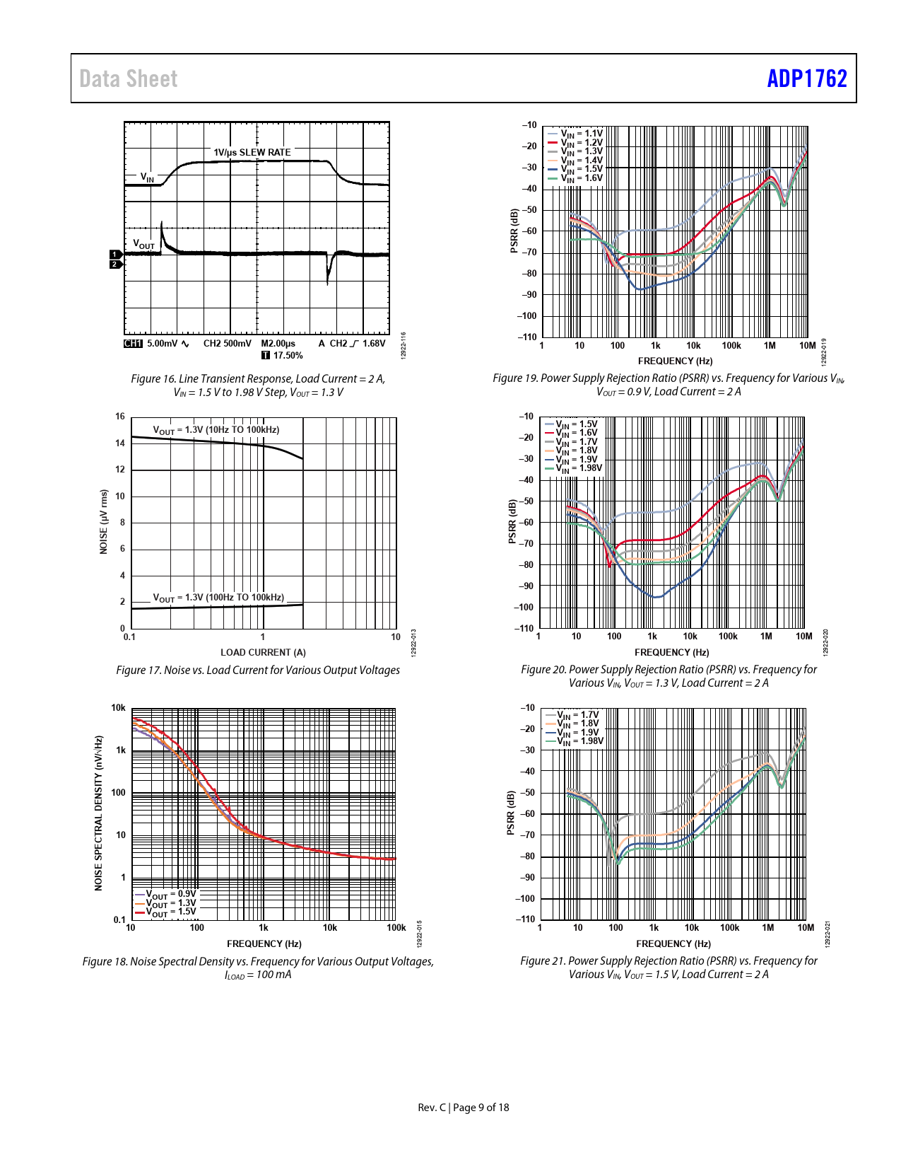Data SheetADP1762–10VIN = 1.1V–20VIN = 1.2V1V/µs SLEW RATEVIN = 1.3VV–30IN = 1.4VVIN = 1.5VVINVIN = 1.6V–40–50B) (d –60RRVOUTS P1–702–80–90–100–110CH1 5.00mVCH2 500mV M2.00µsA CH2 1.68V 116 9 2- 1101001k10k100k1M10M -01 T 17.50% 92 12 22 FREQUENCY (Hz) 129 Figure 16. Line Transient Response, Load Current = 2 A, Figure 19. Power Supply Rejection Ratio (PSRR) vs. Frequency for Various VIN, VIN = 1.5 V to 1.98 V Step, VOUT = 1.3 V VOUT = 0.9 V, Load Current = 2 A 16–10VVIN = 1.5VOUT = 1.3V (10Hz TO 100kHz)–20VIN = 1.6V14VIN = 1.7VVIN = 1.8V–30VIN = 1.9V12VIN = 1.98V–40s) 10rm–50B) (d(µV8–60RRISESOP –706N–804–902VOUT = 1.3V (100Hz TO 100kHz)–1000–110 0 0.1110 013 1101001k10k100k1M10M -02 2- LOAD CURRENT (A) 922 1292 FREQUENCY (Hz) 12 Figure 17. Noise vs. Load Current for Various Output Voltages Figure 20. Power Supply Rejection Ratio (PSRR) vs. Frequency for Various VIN, VOUT = 1.3 V, Load Current = 2 A 10k–10VIN = 1.7VVIN = 1.8V–20Vz)IN = 1.9VVIN = 1.98V1k/√H–30V (n–40TY SI 100–50ENB) (dD L–60ARRRST10P –70SPEC–80ISE1O–90NVOUT = 0.9VV–100OUT = 1.3VVOUT = 1.5V0.1 5 –110 1 101001k10k100k -01 1101001k10k100k1M10M -02 22 FREQUENCY (Hz) 922 129 FREQUENCY (Hz) 12 Figure 18. Noise Spectral Density vs. Frequency for Various Output Voltages, Figure 21. Power Supply Rejection Ratio (PSRR) vs. Frequency for ILOAD = 100 mA Various VIN, VOUT = 1.5 V, Load Current = 2 A Rev. C | Page 9 of 18 Document Outline Features Applications General Description Typical Application Circuits Revision History Specifications Input and Output Capacitor: Recommended Specifications Absolute Maximum Ratings Thermal Data Thermal Resistance/Parameter ESD Caution Pin Configuration and Function Descriptions Typical Performance Characteristics Theory of Operation Soft Start Function Adjustable Output Voltage Enable Feature Power-Good (PG) Feature Applications Information Capacitor Selection Output Capacitor Input Bypass Capacitor Input and Output Capacitor Properties Undervoltage Lockout Current-Limit and Thermal Overload Protection Thermal Considerations PCB Layout Considerations Outline Dimensions Ordering Guide