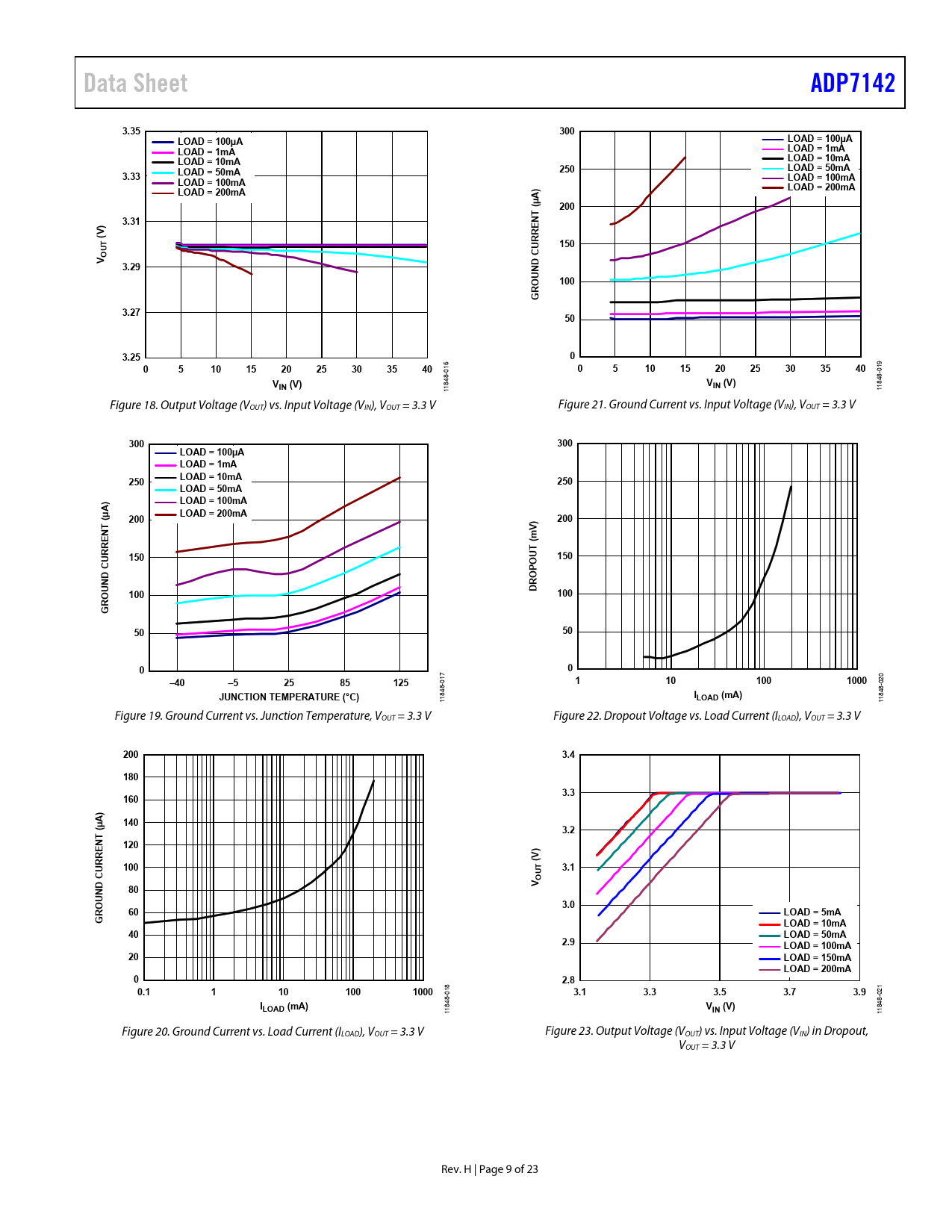| Pages / Page | 23 / 9 — Data Sheet. ADP7142. 3.35. 300. LOAD = 100µA. LOAD = 1mA. LOAD = 10mA. … |