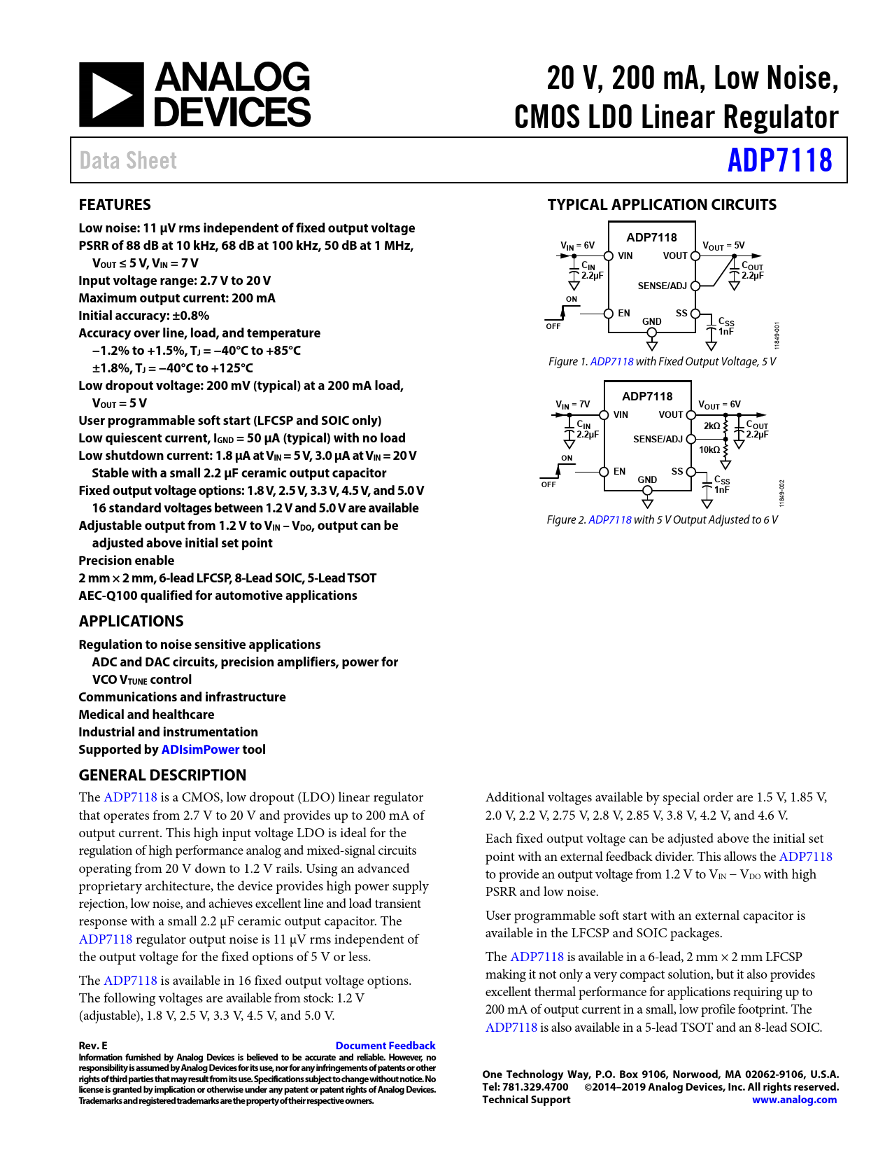 20 V, 200 mA, Low Noise,. CMOS LDO Linear Regulator. Data Sheet. ADP7118. FEATURES. TYPICAL APPLICATION CIRCUITS