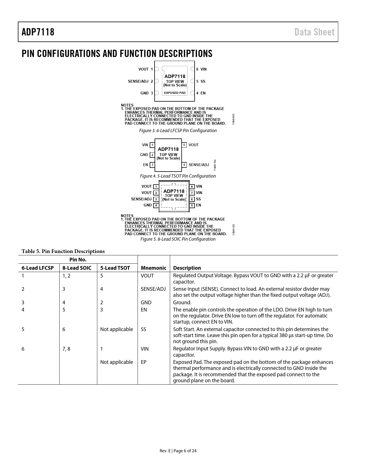 Pages / Page24 / 6 — ADP7118. Data Sheet. PIN CONFIGURATIONS AND FUNCTION DESCRIPTIONS. VOUT …