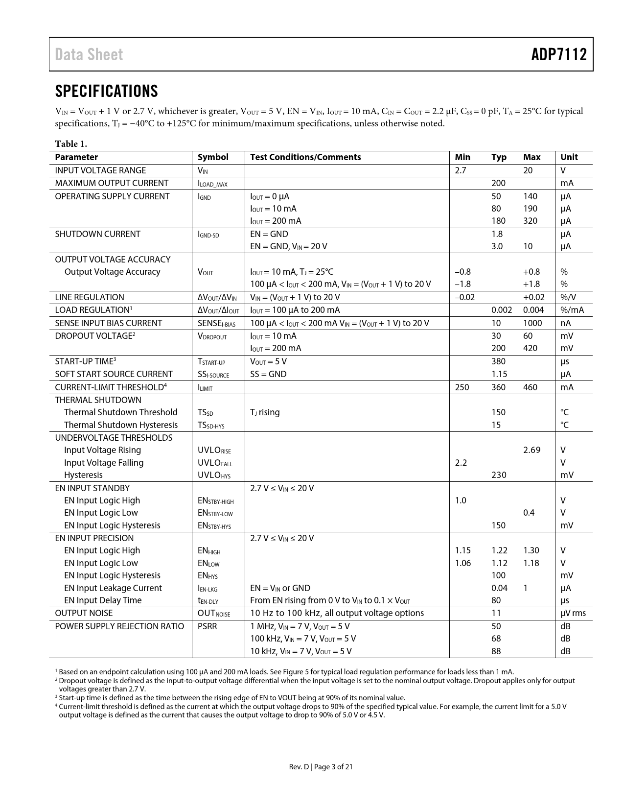 link to page 7 Data SheetADP7112SPECIFICATIONS VIN = VOUT + 1 V or 2.7 V, whichever is greater, VOUT = 5 V, EN = VIN, IOUT = 10 mA, CIN = COUT = 2.2 μF, CSS = 0 pF, TA = 25°C for typical specifications, TJ = −40°C to +125°C for minimum/maximum specifications, unless otherwise noted. Table 1. ParameterSymbolTest Conditions/Comments MinTypMaxUnit INPUT VOLTAGE RANGE VIN 2.7 20 V MAXIMUM OUTPUT CURRENT ILOAD_MAX 200 mA OPERATING SUPPLY CURRENT IGND IOUT = 0 μA 50 140 μA IOUT = 10 mA 80 190 μA IOUT = 200 mA 180 320 μA SHUTDOWN CURRENT IGND-SD EN = GND 1.8 μA EN = GND, VIN = 20 V 3.0 10 μA OUTPUT VOLTAGE ACCURACY Output Voltage Accuracy VOUT IOUT = 10 mA, TJ = 25°C –0.8 +0.8 % 100 μA < IOUT < 200 mA, VIN = (VOUT + 1 V) to 20 V –1.8 +1.8 % LINE REGULATION ∆VOUT/∆VIN VIN = (VOUT + 1 V) to 20 V –0.02 +0.02 %/V LOAD REGULATION1 ∆VOUT/∆IOUT IOUT = 100 μA to 200 mA 0.002 0.004 %/mA SENSE INPUT BIAS CURRENT SENSEI-BIAS 100 μA < IOUT < 200 mA VIN = (VOUT + 1 V) to 20 V 10 1000 nA DROPOUT VOLTAGE2 VDROPOUT IOUT = 10 mA 30 60 mV IOUT = 200 mA 200 420 mV START-UP TIME3 TSTART-UP VOUT = 5 V 380 μs SOFT START SOURCE CURRENT SSI-SOURCE SS = GND 1.15 μA CURRENT-LIMIT THRESHOLD4 ILIMIT 250 360 460 mA THERMAL SHUTDOWN Thermal Shutdown Threshold TSSD TJ rising 150 °C Thermal Shutdown Hysteresis TSSD-HYS 15 °C UNDERVOLTAGE THRESHOLDS Input Voltage Rising UVLORISE 2.69 V Input Voltage Falling UVLOFALL 2.2 V Hysteresis UVLOHYS 230 mV EN INPUT STANDBY 2.7 V ≤ VIN ≤ 20 V EN Input Logic High ENSTBY-HIGH 1.0 V EN Input Logic Low ENSTBY-LOW 0.4 V EN Input Logic Hysteresis ENSTBY-HYS 150 mV EN INPUT PRECISION 2.7 V ≤ VIN ≤ 20 V EN Input Logic High ENHIGH 1.15 1.22 1.30 V EN Input Logic Low ENLOW 1.06 1.12 1.18 V EN Input Logic Hysteresis ENHYS 100 mV EN Input Leakage Current IEN-LKG EN = VIN or GND 0.04 1 μA EN Input Delay Time tEN-DLY From EN rising from 0 V to VIN to 0.1 × VOUT 80 μs OUTPUT NOISE OUTNOISE 10 Hz to 100 kHz, all output voltage options 11 μV rms POWER SUPPLY REJECTION RATIO PSRR 1 MHz, VIN = 7 V, VOUT = 5 V 50 dB 100 kHz, VIN = 7 V, VOUT = 5 V 68 dB 10 kHz, VIN = 7 V, VOUT = 5 V 88 dB 1 Based on an endpoint calculation using 100 μA and 200 mA loads. See Figure 5 for typical load regulation performance for loads less than 1 mA. 2 Dropout voltage is defined as the input-to-output voltage differential when the input voltage is set to the nominal output voltage. Dropout applies only for output voltages greater than 2.7 V. 3 Start-up time is defined as the time between the rising edge of EN to VOUT being at 90% of its nominal value. 4 Current-limit threshold is defined as the current at which the output voltage drops to 90% of the specified typical value. For example, the current limit for a 5.0 V output voltage is defined as the current that causes the output voltage to drop to 90% of 5.0 V or 4.5 V. Rev. D | Page 3 of 21 Document Outline Features Applications Typical Application Circuits General Description Revision History Specifications Input and Output Capacitance, Recommended Specifications Absolute Maximum Ratings Thermal Data Thermal Resistance ESD Caution Pin Configuration and Function Descriptions Typical Performance Characteristics Theory of Operation Applications Information Capacitor Selection Output Capacitor Input Bypass Capacitor Input and Output Capacitor Properties Programable Precision Enable Soft Start Noise Reduction of the ADP7112 in Adjustable Mode Current-Limit and Thermal Overload Protection Effect of Noise Reduction on Start-Up Time Thermal Considerations PCB Layout Considerations Outline Dimensions Ordering Guide