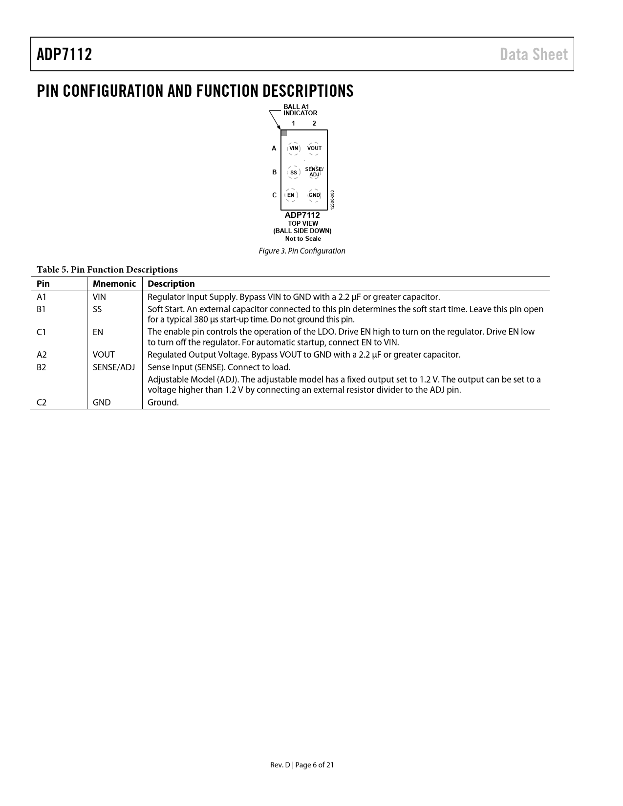 Pages / Page21 / 6 — ADP7112. Data Sheet. PIN CONFIGURATION AND FUNCTION DESCRIPTIONS. BALL …
