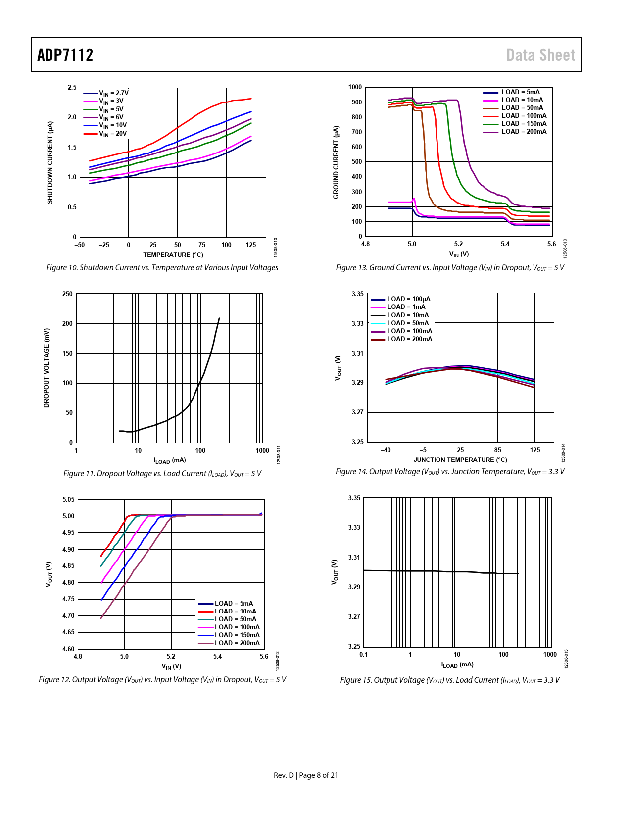 12508- 1250 Figure 11. Dropout Voltage vs. Load Current (I Figure 14. Output Voltage (V LOAD), VOUT = 5 V OUT) vs. Junction Temperature, VOUT = 3.3 V