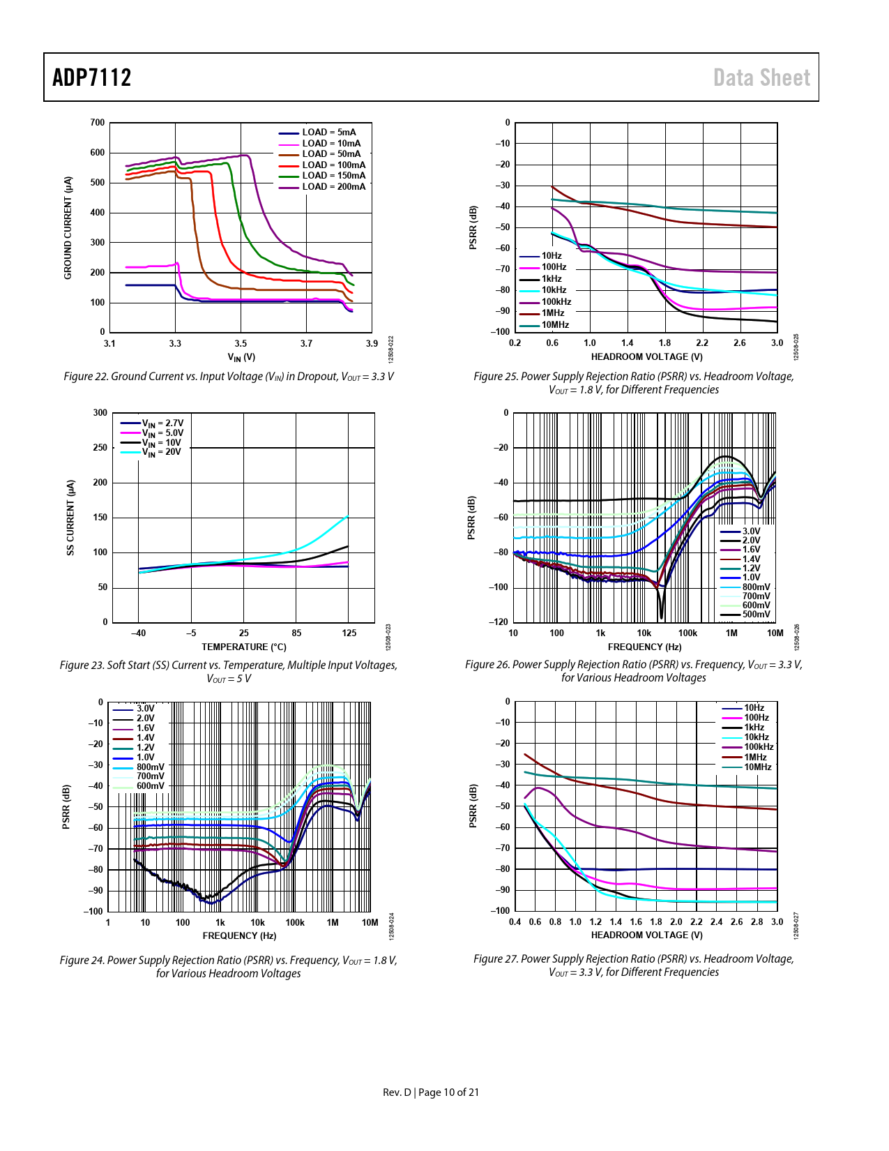 12508- 1250 Figure 22. Ground Current vs. Input Voltage (VIN) in Dropout, VOUT = 3.3 V Figure 25. Power Supply Rejection Ratio (PSRR) vs. Headroom Voltage, VOUT = 1.8 V, for Different Frequencies