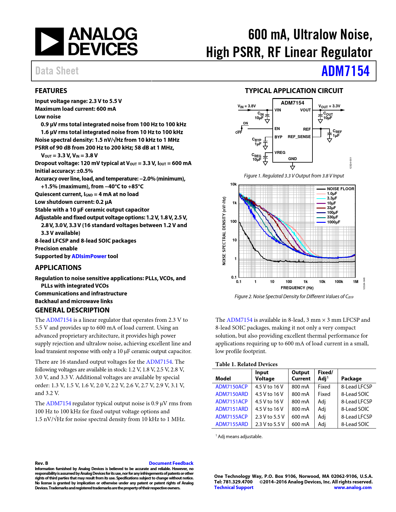 order: 1.3 V, 1.5 V, 1.6 V, 2.0 V, 2.2 V, 2.6 V, 2.7 V, 2.9 V, 3.1 V, ADM7150ACP 4.5 V to 16 V 800 mA Fixed 8-Lead LFCSP and 3.2 V. ADM7150ARD 4.5 V to 16 V 800 mA Fixed 8-Lead SOIC The ADM7154 regulator typical output noise is 0.9 μV rms from ADM7151ACP 4.5 V to 16 V 800 mA Adj 8-Lead LFCSP 100 Hz to 100 kHz for fixed output voltage options and ADM7151ARD 4.5 V to 16 V 800 mA Adj 8-Lead SOIC 1.5 nV/√Hz for noise spectral density from 10 kHz to 1 MHz. ADM7155ACP 2.3 V to 5.5 V 600 mA Adj 8-Lead LFCSP ADM7155ARD 2.3 V to 5.5 V 600 mA Adj 8-Lead SOIC 1 Adj means adjustable.