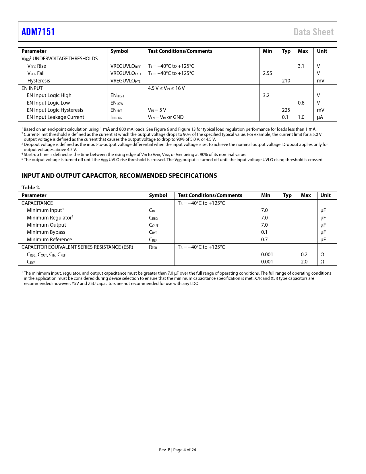 link to page 7 link to page 7 link to page 7 link to page 8 link to page 8 link to page 8 ADM7151Data SheetParameterSymbolTest Conditions/CommentsMinTyp MaxUnit V 5 REG UNDERVOLTAGE THRESHOLDS VREG Rise VREGUVLORISE TJ = −40°C to +125°C 3.1 V VREG Fall VREGUVLOFALL TJ = −40°C to +125°C 2.55 V Hysteresis VREGUVLOHYS 210 mV EN INPUT 4.5 V ≤ VIN ≤ 16 V EN Input Logic High ENHIGH 3.2 V EN Input Logic Low ENLOW 0.8 V EN Input Logic Hysteresis ENHYS VIN = 5 V 225 mV EN Input Leakage Current IEN-LKG VEN = VIN or GND 0.1 1.0 µA 1 Based on an end-point calculation using 1 mA and 800 mA loads. See Figure 6 and Figure 13 for typical load regulation performance for loads less than 1 mA. 2 Current-limit threshold is defined as the current at which the output voltage drops to 90% of the specified typical value. For example, the current limit for a 5.0 V output voltage is defined as the current that causes the output voltage to drop to 90% of 5.0 V, or 4.5 V. 3 Dropout voltage is defined as the input-to-output voltage differential when the input voltage is set to achieve the nominal output voltage. Dropout applies only for output voltages above 4.5 V. 4 Start-up time is defined as the time between the rising edge of VEN to VOUT, VREG, or VREF being at 90% of its nominal value. 5 The output voltage is turned off until the VREG UVLO rise threshold is crossed. The VREG output is turned off until the input voltage UVLO rising threshold is crossed. INPUT AND OUTPUT CAPACITOR, RECOMMENDED SPECIFICATIONSTable 2. ParameterSymbolTest Conditions/CommentsMinTypMaxUnit CAPACITANCE TA = −40°C to +125°C Minimum Input1 CIN 7.0 µF Minimum Regulator1 CREG 7.0 µF Minimum Output1 COUT 7.0 µF Minimum Bypass CBYP 0.1 µF Minimum Reference CREF 0.7 µF CAPACITOR EQUIVALENT SERIES RESISTANCE (ESR) RESR TA = −40°C to +125°C CREG, COUT, CIN, CREF 0.001 0.2 Ω CBYP 0.001 2.0 Ω 1 The minimum input, regulator, and output capacitance must be greater than 7.0 µF over the full range of operating conditions. The full range of operating conditions in the application must be considered during device selection to ensure that the minimum capacitance specification is met. X7R and X5R type capacitors are recommended; however, Y5V and Z5U capacitors are not recommended for use with any LDO. Rev. B | Page 4 of 24 Document Outline FEATURES APPLICATIONS TYPICAL APPLICATION CIRCUIT GENERAL DESCRIPTION REVISION HISTORY SPECIFICATIONS INPUT AND OUTPUT CAPACITOR, RECOMMENDED SPECIFICATIONS ABSOLUTE MAXIMUM RATINGS THERMAL DATA THERMAL RESISTANCE ESD CAUTION PIN CONFIGURATIONS AND FUNCTION DESCRIPTIONS TYPICAL PERFORMANCE CHARACTERISTICS THEORY OF OPERATION APPLICATIONS INFORMATION MODEL SELECTION CAPACITOR SELECTION Output Capacitor Input and VREG Capacitor REF Capacitor BYP Capacitor Capacitor Properties ENABLE (EN) AND UNDERVOLTAGE LOCKOUT (UVLO) START-UP TIME REF, BYP, AND VREG PINS CURRENT-LIMIT AND THERMAL OVERLOAD PROTECTION THERMAL CONSIDERATIONS Thermal Characterization Parameter (ΨJB) PRINTED CIRCUIT BOARD LAYOUT CONSIDERATIONS OUTLINE DIMENSIONS ORDERING GUIDE