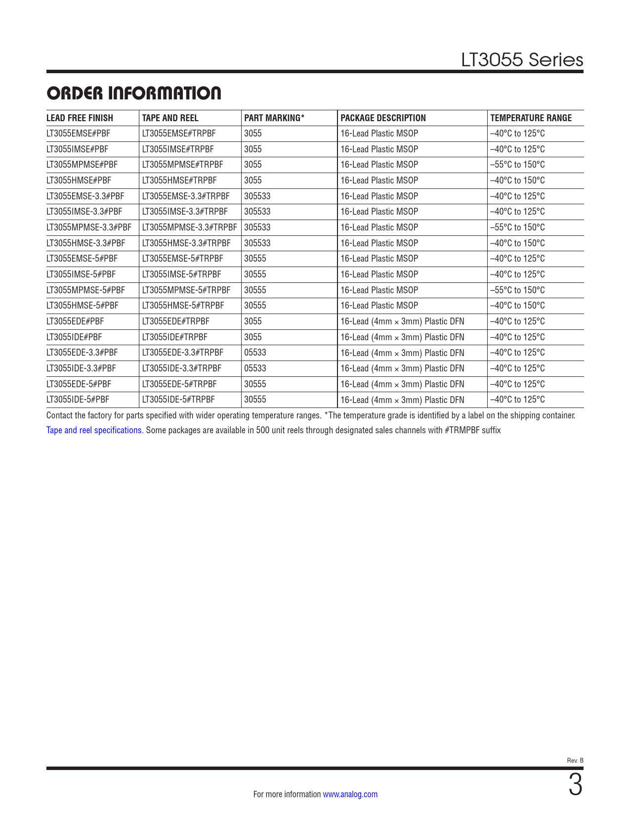 LT3055 Series ORDER INFORMATION LEAD FREE FINISHTAPE AND REELPART MARKING*PACKAGE DESCRIPTIONTEMPERATURE RANGE LT3055EMSE#PBF LT3055EMSE#TRPBF 3055 16-Lead Plastic MSOP –40°C to 125°C LT3055IMSE#PBF LT3055IMSE#TRPBF 3055 16-Lead Plastic MSOP –40°C to 125°C LT3055MPMSE#PBF LT3055MPMSE#TRPBF 3055 16-Lead Plastic MSOP –55°C to 150°C LT3055HMSE#PBF LT3055HMSE#TRPBF 3055 16-Lead Plastic MSOP –40°C to 150°C LT3055EMSE-3.3#PBF LT3055EMSE-3.3#TRPBF 305533 16-Lead Plastic MSOP –40°C to 125°C LT3055IMSE-3.3#PBF LT3055IMSE-3.3#TRPBF 305533 16-Lead Plastic MSOP –40°C to 125°C LT3055MPMSE-3.3#PBF LT3055MPMSE-3.3#TRPBF 305533 16-Lead Plastic MSOP –55°C to 150°C LT3055HMSE-3.3#PBF LT3055HMSE-3.3#TRPBF 305533 16-Lead Plastic MSOP –40°C to 150°C LT3055EMSE-5#PBF LT3055EMSE-5#TRPBF 30555 16-Lead Plastic MSOP –40°C to 125°C LT3055IMSE-5#PBF LT3055IMSE-5#TRPBF 30555 16-Lead Plastic MSOP –40°C to 125°C LT3055MPMSE-5#PBF LT3055MPMSE-5#TRPBF 30555 16-Lead Plastic MSOP –55°C to 150°C LT3055HMSE-5#PBF LT3055HMSE-5#TRPBF 30555 16-Lead Plastic MSOP –40°C to 150°C LT3055EDE#PBF LT3055EDE#TRPBF 3055 16-Lead (4mm × 3mm) Plastic DFN –40°C to 125°C LT3055IDE#PBF LT3055IDE#TRPBF 3055 16-Lead (4mm × 3mm) Plastic DFN –40°C to 125°C LT3055EDE-3.3#PBF LT3055EDE-3.3#TRPBF 05533 16-Lead (4mm × 3mm) Plastic DFN –40°C to 125°C LT3055IDE-3.3#PBF LT3055IDE-3.3#TRPBF 05533 16-Lead (4mm × 3mm) Plastic DFN –40°C to 125°C LT3055EDE-5#PBF LT3055EDE-5#TRPBF 30555 16-Lead (4mm × 3mm) Plastic DFN –40°C to 125°C LT3055IDE-5#PBF LT3055IDE-5#TRPBF 30555 16-Lead (4mm × 3mm) Plastic DFN –40°C to 125°C Contact the factory for parts specified with wider operating temperature ranges. *The temperature grade is identified by a label on the shipping container. Tape and reel specifications. Some packages are available in 500 unit reels through designated sales channels with #TRMPBF suffix Rev. B For more information www.analog.com 3 Document Outline Features Applications Description Typical Application Absolute Maximum Ratings Pin Configuration Order Information Electrical Characteristics Typical Performance Characteristics Pin Functions Block Diagram Operation Applications Information Package Description Revision History Typical Application Related Parts