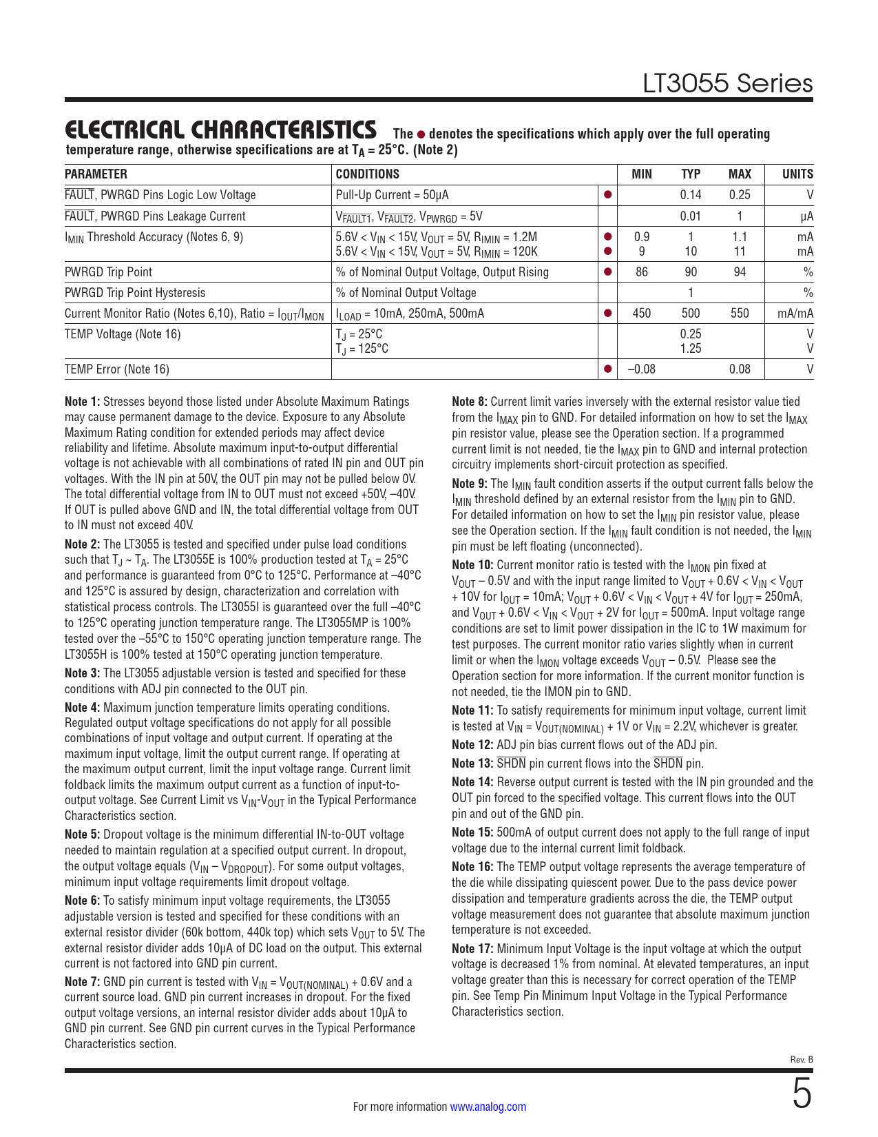 FAULT, PWRGD Pins Logic Low Voltage Pull-Up Current = 50μA l 0.14 0.25 V FAULT, PWRGD Pins Leakage Current VFAULT1, VFAULT2, VPWRGD = 5V 0.01 1 μA IMIN Threshold Accuracy (Notes 6, 9) 5.6V < VIN < 15V, VOUT = 5V, RIMIN = 1.2M l 0.9 1 1.1 mA 5.6V < VIN < 15V, VOUT = 5V, RIMIN = 120K l 9 10 11 mA PWRGD Trip Point % of Nominal Output Voltage, Output Rising l 86 90 94 % PWRGD Trip Point Hysteresis % of Nominal Output Voltage 1 % Current Monitor Ratio (Notes 6,10), Ratio = IOUT/IMON ILOAD = 10mA, 250mA, 500mA l 450 500 550 mA/mA TEMP Voltage (Note 16) TJ = 25°C 0.25 V TJ = 125°C 1.25 V TEMP Error (Note 16) l –0.08 0.08 V