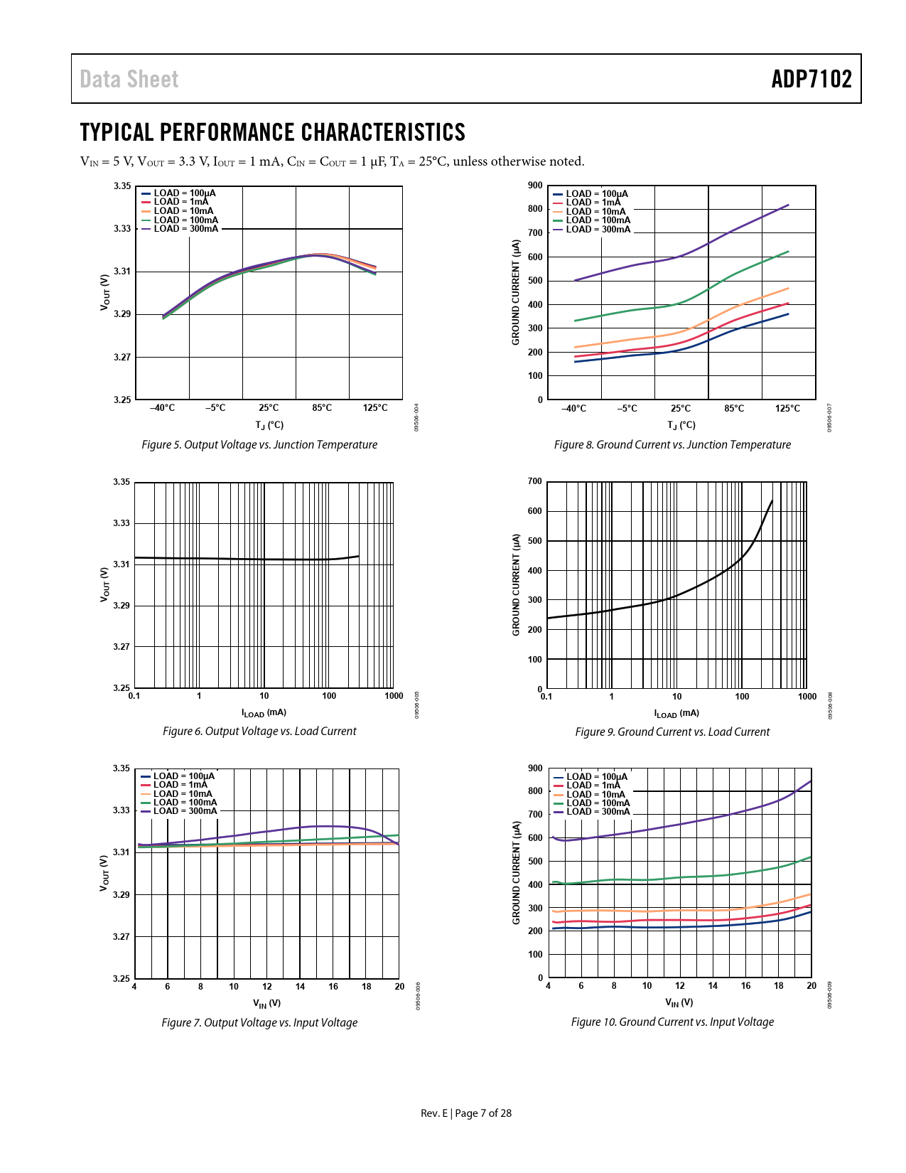 Data Sheet. ADP7102. TYPICAL PERFORMANCE CHARACTERISTICS. 3.35. 900. LOAD = 100µA. LOAD = 1mA. LOAD = 10mA. 800. LOAD = 100mA. 3.33