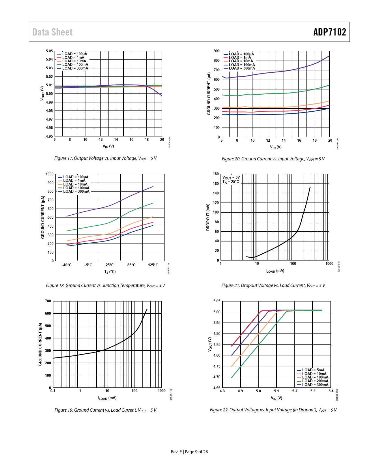 Data Sheet. ADP7102. 5.05. 900. LOAD = 100µA. 5.04. LOAD = 1mA. LOAD = 10mA. 800. LOAD = 100mA. 5.03. LOAD = 300mA. 700. 5.02. A) µ ( 600. 5.01. NT E