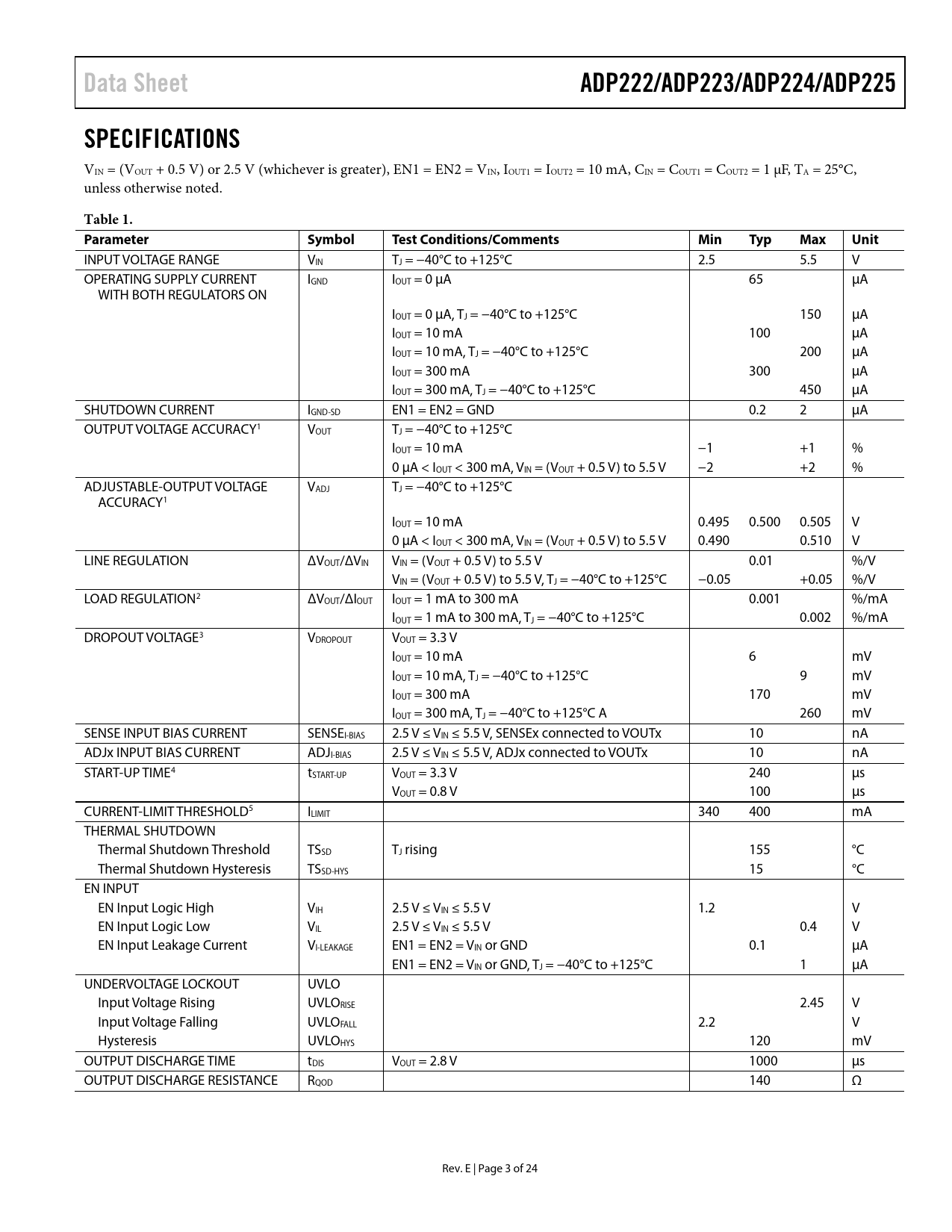 Data Sheet. ADP222/ADP223/ADP224/ADP225. SPECIFICATIONS. Table 1. Parameter. Symbol. Test Conditions/Comments. Min. Typ. Max. Unit