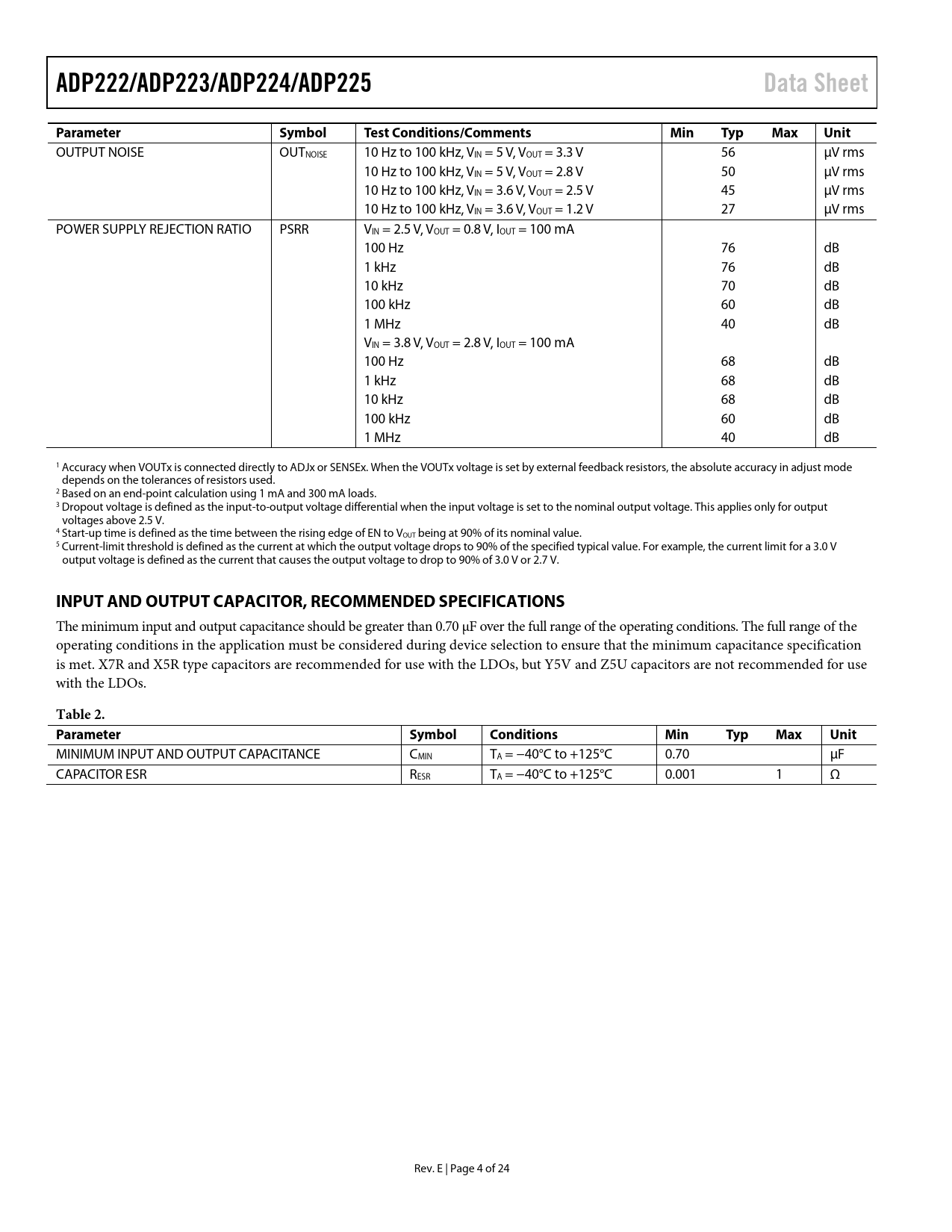 ADP222/ADP223/ADP224/ADP225Data SheetParameterSymbolTest Conditions/CommentsMinTypMaxUnit OUTPUT NOISE OUTNOISE 10 Hz to 100 kHz, VIN = 5 V, VOUT = 3.3 V 56 µV rms 10 Hz to 100 kHz, VIN = 5 V, VOUT = 2.8 V 50 µV rms 10 Hz to 100 kHz, VIN = 3.6 V, VOUT = 2.5 V 45 µV rms 10 Hz to 100 kHz, VIN = 3.6 V, VOUT = 1.2 V 27 µV rms POWER SUPPLY REJECTION RATIO PSRR VIN = 2.5 V, VOUT = 0.8 V, IOUT = 100 mA 100 Hz 76 dB 1 kHz 76 dB 10 kHz 70 dB 100 kHz 60 dB 1 MHz 40 dB VIN = 3.8 V, VOUT = 2.8 V, IOUT = 100 mA 100 Hz 68 dB 1 kHz 68 dB 10 kHz 68 dB 100 kHz 60 dB 1 MHz 40 dB 1 Accuracy when VOUTx is connected directly to ADJx or SENSEx. When the VOUTx voltage is set by external feedback resistors, the absolute accuracy in adjust mode depends on the tolerances of resistors used. 2 Based on an end-point calculation using 1 mA and 300 mA loads. 3 Dropout voltage is defined as the input-to-output voltage differential when the input voltage is set to the nominal output voltage. This applies only for output voltages above 2.5 V. 4 Start-up time is defined as the time between the rising edge of EN to VOUT being at 90% of its nominal value. 5 Current-limit threshold is defined as the current at which the output voltage drops to 90% of the specified typical value. For example, the current limit for a 3.0 V output voltage is defined as the current that causes the output voltage to drop to 90% of 3.0 V or 2.7 V. INPUT AND OUTPUT CAPACITOR, RECOMMENDED SPECIFICATIONS The minimum input and output capacitance should be greater than 0.70 µF over the ful range of the operating conditions. The ful range of the operating conditions in the application must be considered during device selection to ensure that the minimum capacitance specification is met. X7R and X5R type capacitors are recommended for use with the LDOs, but Y5V and Z5U capacitors are not recommended for use with the LDOs. Table 2. ParameterSymbolConditionsMinTypMaxUnit MINIMUM INPUT AND OUTPUT CAPACITANCE CMIN TA = −40°C to +125°C 0.70 µF CAPACITOR ESR RESR TA = −40°C to +125°C 0.001 1 Ω Rev. E | Page 4 of 24 Document Outline Features Applications Typical Application Circuits General Description Table of Contents Revision History Specifications Input and Output Capacitor, Recommended Specifications Absolute Maximum Ratings Thermal Data Thermal Resistance ESD Caution Pin Configuration and Function Descriptions Typical Performance Characteristics Theory of Operation Applications Information Capacitor Selection Output Capacitor Input Bypass Capacitor Input and Output Capacitor Properties Enable Feature Quick Output Discharge (QOD) Function Current Limit and Thermal Overload Protection Thermal Considerations Printed Circuit Board Layout Considerations Outline Dimensions Ordering Guide