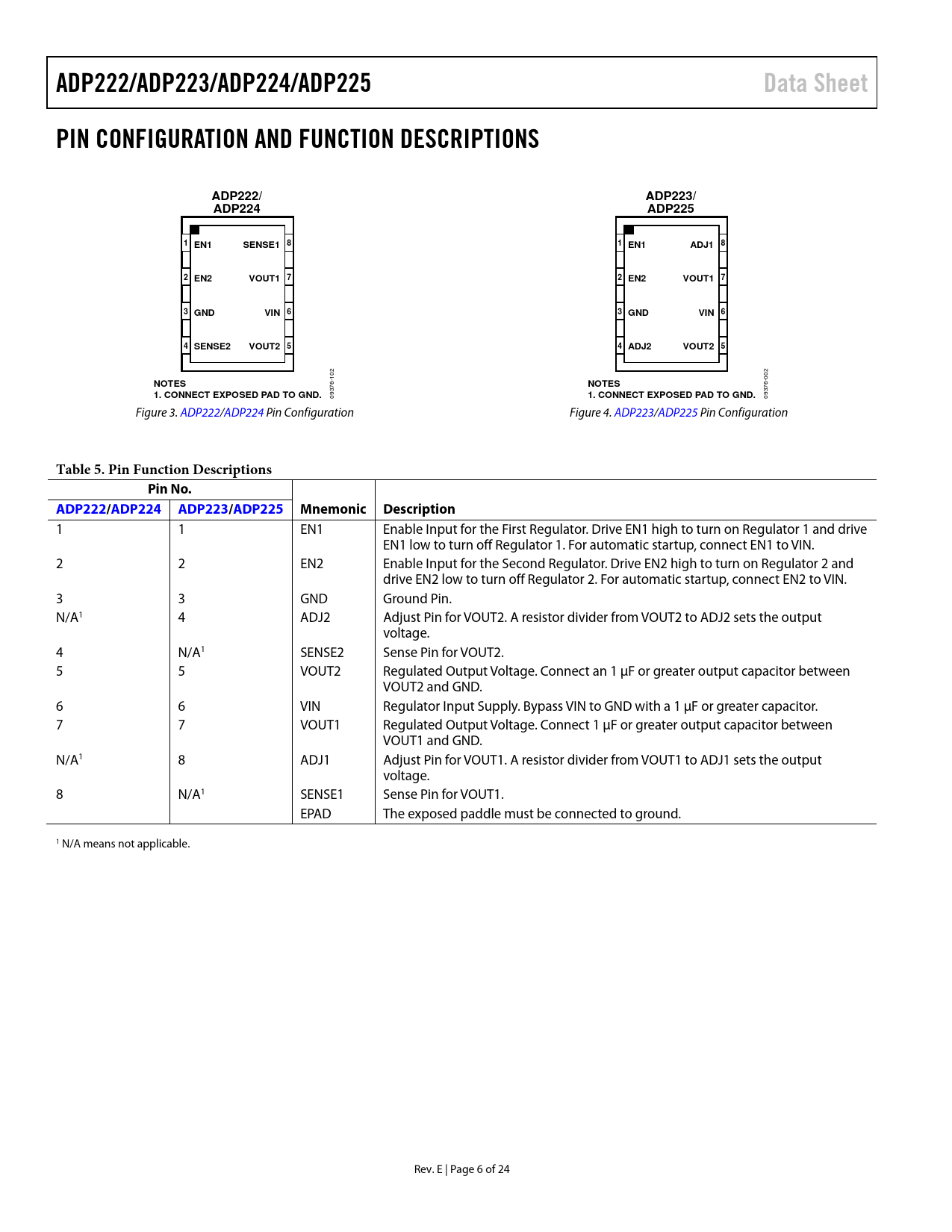 Pages / Page24 / 6 — ADP222/ADP223/ADP224/ADP225. Data Sheet. PIN CONFIGURATION AND FUNCTION …