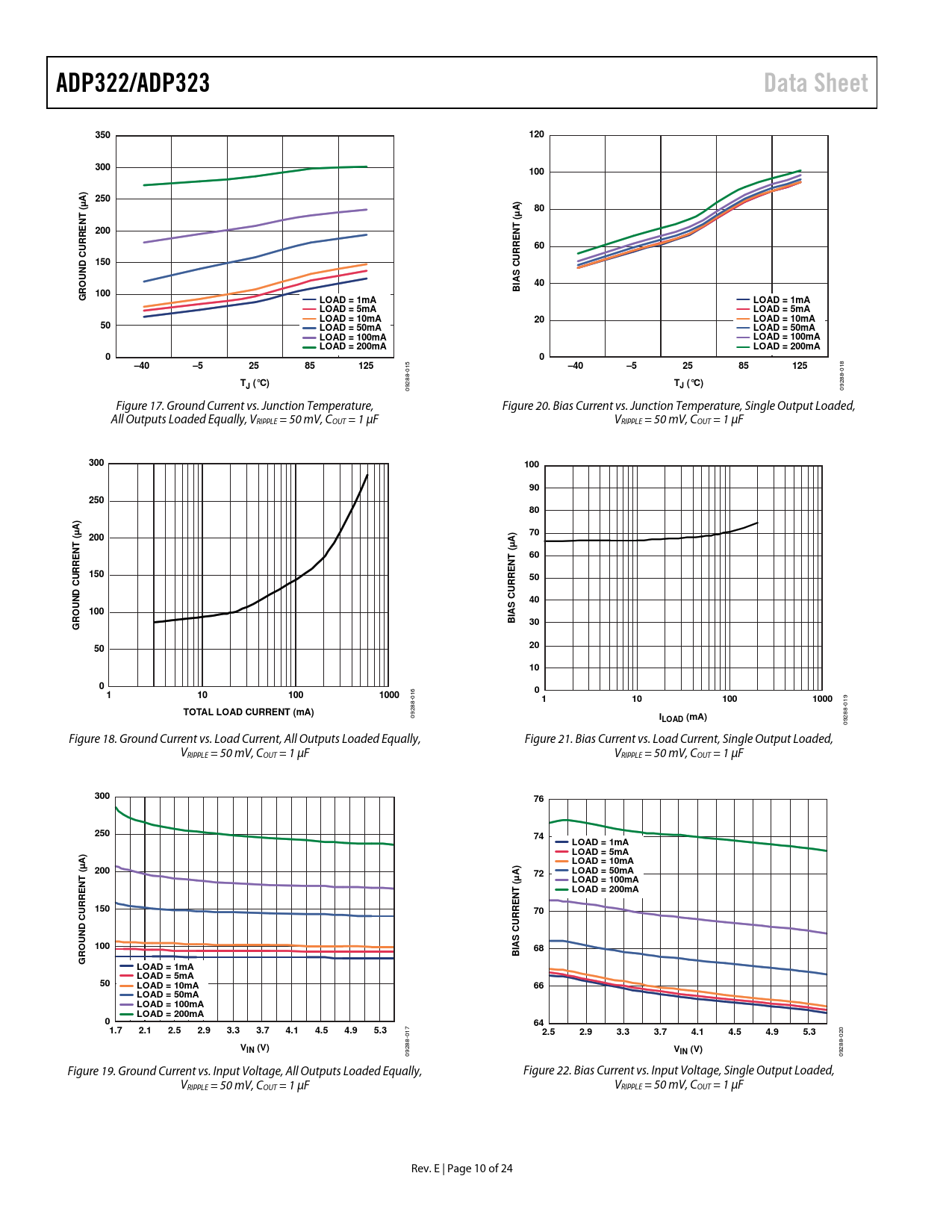 09288- Figure 18. Ground Current vs. Load Current, All Outputs Loaded Equally, Figure 21. Bias Current vs. Load Current, Single Output Loaded, VRIPPLE = 50 mV, COUT = 1 µF VRIPPLE = 50 mV, COUT = 1 µF