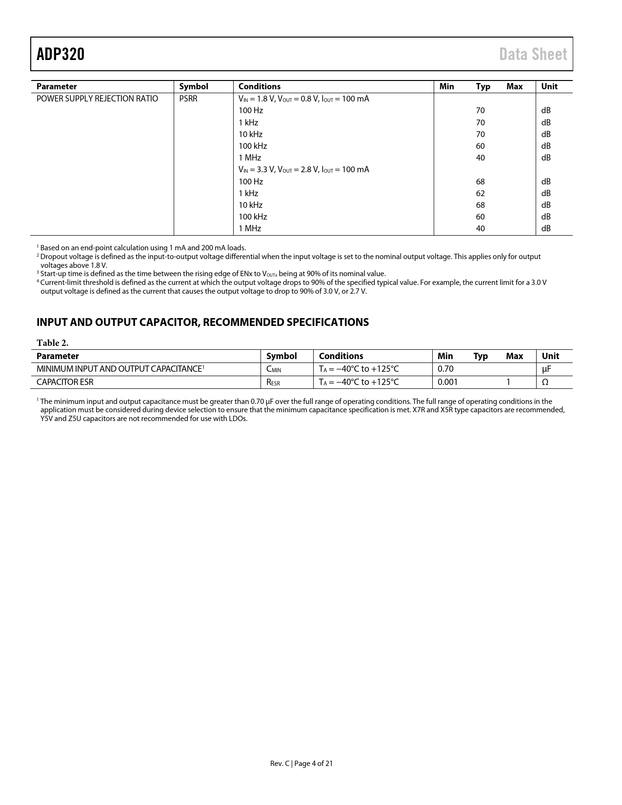 ADP320 Data Sheet Parameter Symbol Conditions Min Typ Max Unit INPUT AND OUTPUT CAPACITOR, RECOMMENDED SPECIFICATIONS