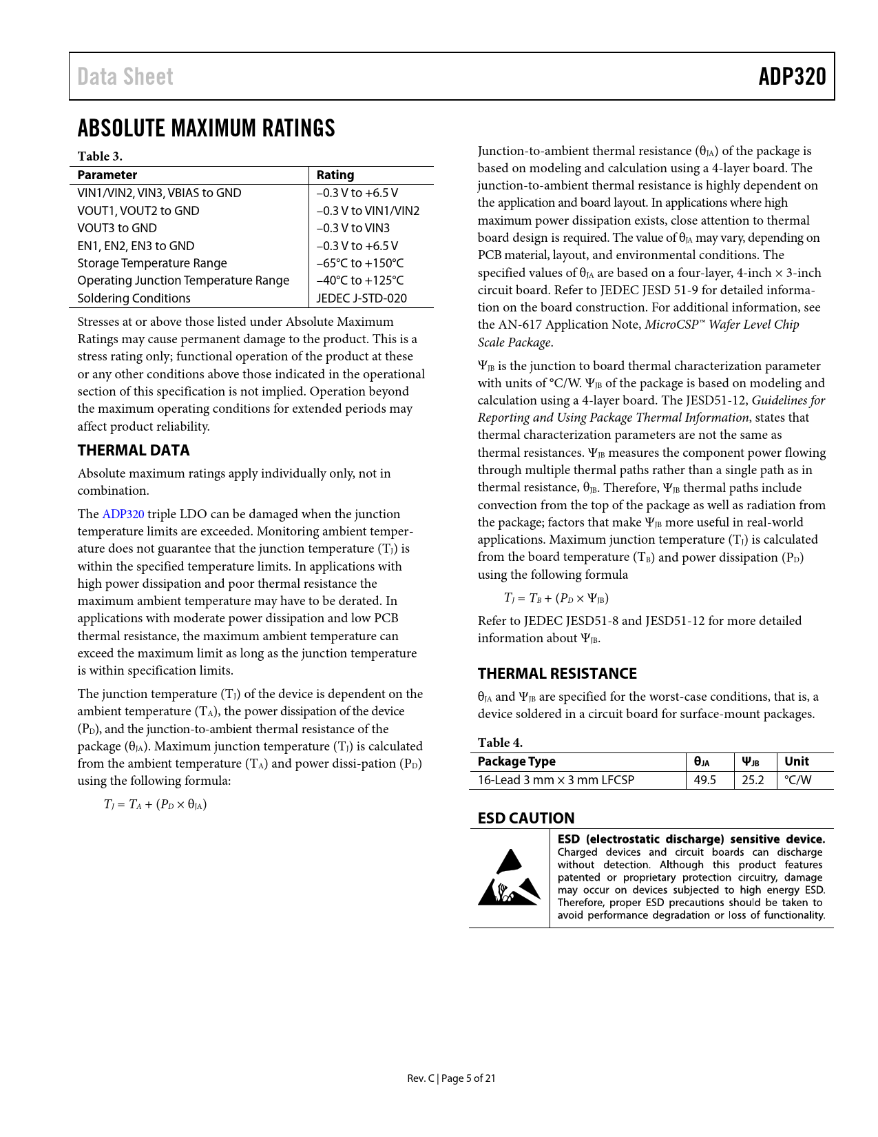 Data Sheet ADP320 ABSOLUTE MAXIMUM RATINGS Table 3 Parameter Rating THERMAL DATA THERMAL RESISTANCE Table 4 Package Type θJA ΨJB