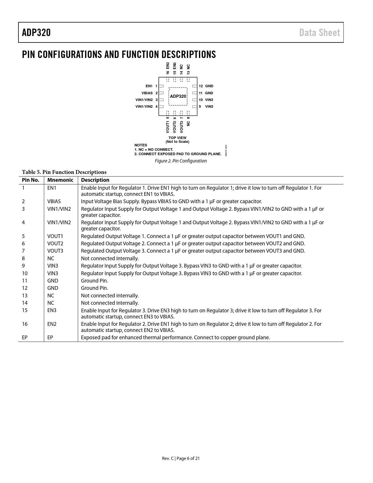 ADP320Data SheetPIN CONFIGURATIONS AND FUNCTION DESCRIPTIONS23NNCCEENN65431111EN1 112 GNDVBIAS 211 GNDADP320VIN1/VIN2 310 VIN3VIN1/VIN2 49VIN35678123TTTCUUUNOOOVVVTOP VIEW(Not to Scale)NOTES 2 1. NC = NO CONNECT. 00 4- 2. CONNECT EXPOSED PAD TO GROUND PLANE. 87 09 Figure 2. Pin Configuration Table 5. Pin Function Descriptions Pin No.MnemonicDescription 1 EN1 Enable Input for Regulator 1. Drive EN1 high to turn on Regulator 1; drive it low to turn off Regulator 1. For automatic startup, connect EN1 to VBIAS. 2 VBIAS Input Voltage Bias Supply. Bypass VBIAS to GND with a 1 μF or greater capacitor. 3 VIN1/VIN2 Regulator Input Supply for Output Voltage 1 and Output Voltage 2. Bypass VIN1/VIN2 to GND with a 1 μF or greater capacitor. 4 VIN1/VIN2 Regulator Input Supply for Output Voltage 1 and Output Voltage 2. Bypass VIN1/VIN2 to GND with a 1 μF or greater capacitor. 5 VOUT1 Regulated Output Voltage 1. Connect a 1 μF or greater output capacitor between VOUT1 and GND. 6 VOUT2 Regulated Output Voltage 2. Connect a 1 μF or greater output capacitor between VOUT2 and GND. 7 VOUT3 Regulated Output Voltage 3. Connect a 1 μF or greater output capacitor between VOUT3 and GND. 8 NC Not connected internally. 9 VIN3 Regulator Input Supply for Output Voltage 3. Bypass VIN3 to GND with a 1 μF or greater capacitor. 10 VIN3 Regulator Input Supply for Output Voltage 3. Bypass VIN3 to GND with a 1 μF or greater capacitor. 11 GND Ground Pin. 12 GND Ground Pin. 13 NC Not connected internally. 14 NC Not connected internally. 15 EN3 Enable Input for Regulator 3. Drive EN3 high to turn on Regulator 3; drive it low to turn off Regulator 3. For automatic startup, connect EN3 to VBIAS. 16 EN2 Enable Input for Regulator 2. Drive EN1 high to turn on Regulator 2; drive it low to turn off Regulator 2. For automatic startup, connect EN2 to VBIAS. EP EP Exposed pad for enhanced thermal performance. Connect to copper ground plane. Rev. C | Page 6 of 21 Document Outline Features Applications Typical Application Circuits General Description Revision History Specifications Input and Output Capacitor, Recommended Specifications Absolute Maximum Ratings THERMAL DATA Thermal Resistance ESD Caution Pin Configurations and Function Descriptions Typical Performance Characteristics Theory of Operation Applications Information ADIsimPower Design Tool Capacitor Selection Output Capacitor Input Bypass Capacitor Input and Output Capacitor Properties Undervoltage Lockout Enable Feature Current-Limit and Thermal Overload Protection Thermal Considerations Printed Circuit Board Layout Considerations Outline Dimensions Ordering Guide