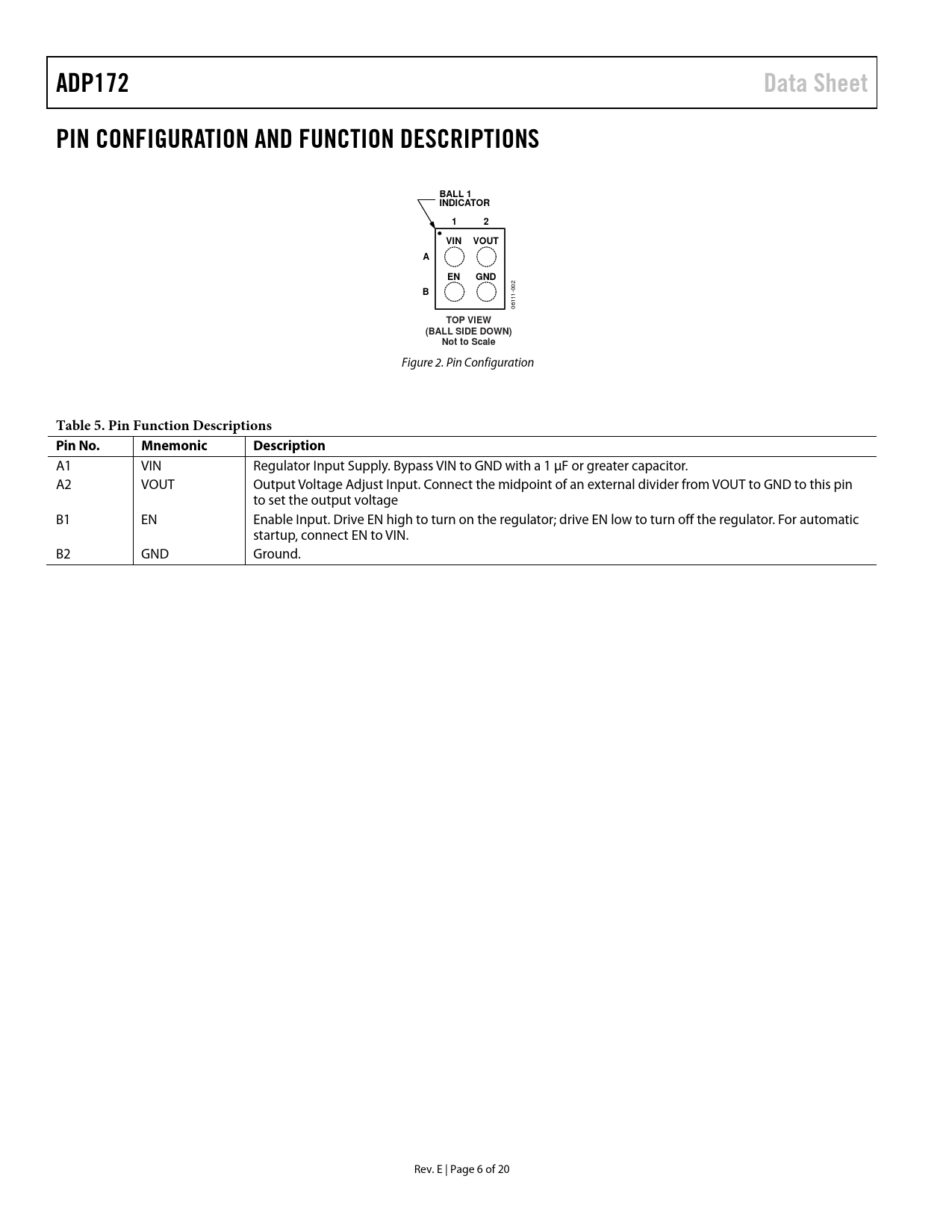 Pages / Page20 / 6 — ADP172. Data Sheet. PIN CONFIGURATION AND FUNCTION DESCRIPTIONS. BALL 1 …
