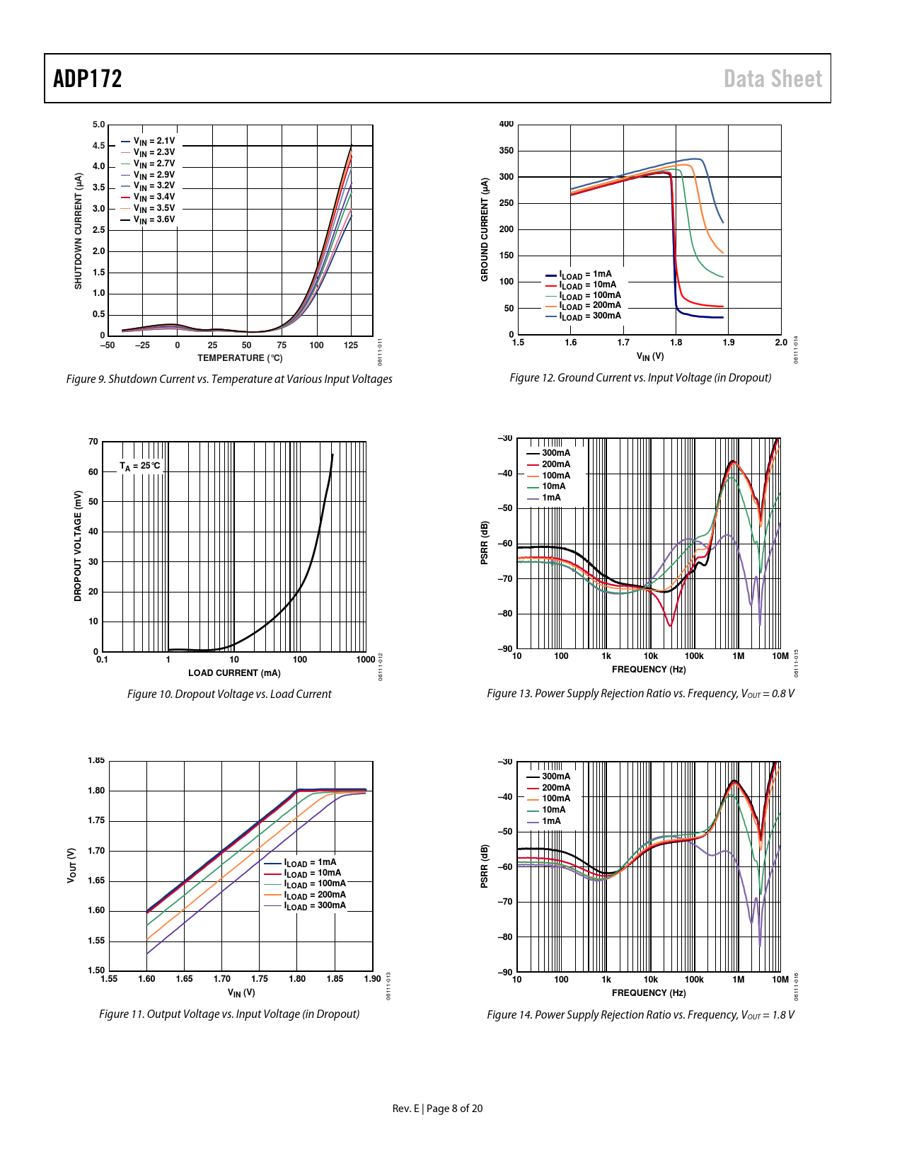 ADP172Data Sheet5.0400V4.5IN = 2.1VV350IN = 2.3V4.0VIN = 2.7V VA)IN = 2.9V300µVA)(3.5IN = 3.2VµV(NTIN = 3.4V2503.0VNTIN = 3.5VVIN = 3.6V2.5200N CURRE W2.0150UND CURREDO1.5ROILOAD = 1mAHUTG100SILOAD = 10mA1.0ILOAD = 100mA50ILOAD = 200mA0.5ILOAD = 300mA00–50–2502550751001251.51.61.71.81.92.0 011 014 TEMPERATURE (°C)VIN (V) 06111- 06111- Figure 9. Shutdown Current vs. Temperature at Various Input Voltages Figure 12. Ground Current vs. Input Voltage (in Dropout) 70–30300mAT200mA60A = 25°C–40100mA)10mAV 501mAm (–50GEB)40dOLTA–60RR ( ST V 30POU–70OP R 20D–80100–900.11101001000101001k10k100k1M10M 015 012 LOAD CURRENT (mA)FREQUENCY (Hz) 06111- 06111- Figure 10. Dropout Voltage vs. Load Current Figure 13. Power Supply Rejection Ratio vs. Frequency, VOUT = 0.8 V 1.85–30300mA1.80200mA–40100mA 10mA1.751mA–501.70B)(V)dILOAD = 1mAUT–60OILOAD = 10mARR (V1.65ISLOAD = 100mAPILOAD = 200mA I–701.60LOAD = 300mA1.55–801.50–901.551.601.651.701.751.801.851.90 013 101001k10k100k1M10M 016 VIN (V)FREQUENCY (Hz) 06111- 06111- Figure 11. Output Voltage vs. Input Voltage (in Dropout) Figure 14. Power Supply Rejection Ratio vs. Frequency, VOUT = 1.8 V Rev. E | Page 8 of 20 Document Outline Features Applications Typical Application Circuits General Description Table of Contents Revision History Specifications Input and Output Capacitor, Recommended Specifications Absolute Maximum Ratings Thermal Data Thermal Resistance ESD Caution Pin Configuration and Function Descriptions Typical Performance Characteristics Theory of Operation Applications Information Capacitor Selection Output Capacitor Input Bypass Capacitor Input and Output Capacitor Properties Undervoltage Lockout Enable Feature Current Limit and Thermal Overload Protection Thermal Considerations Printed Circuit Board Layout Considerations Outline Dimensions Ordering Guide