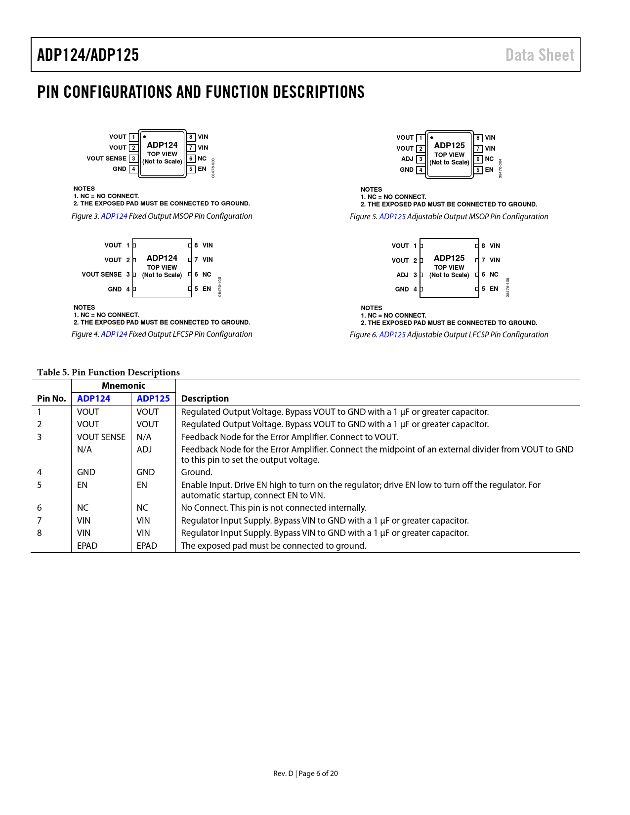 Pages / Page20 / 6 — ADP124/ADP125. Data Sheet. PIN CONFIGURATIONS AND FUNCTION DESCRIPTIONS. …
