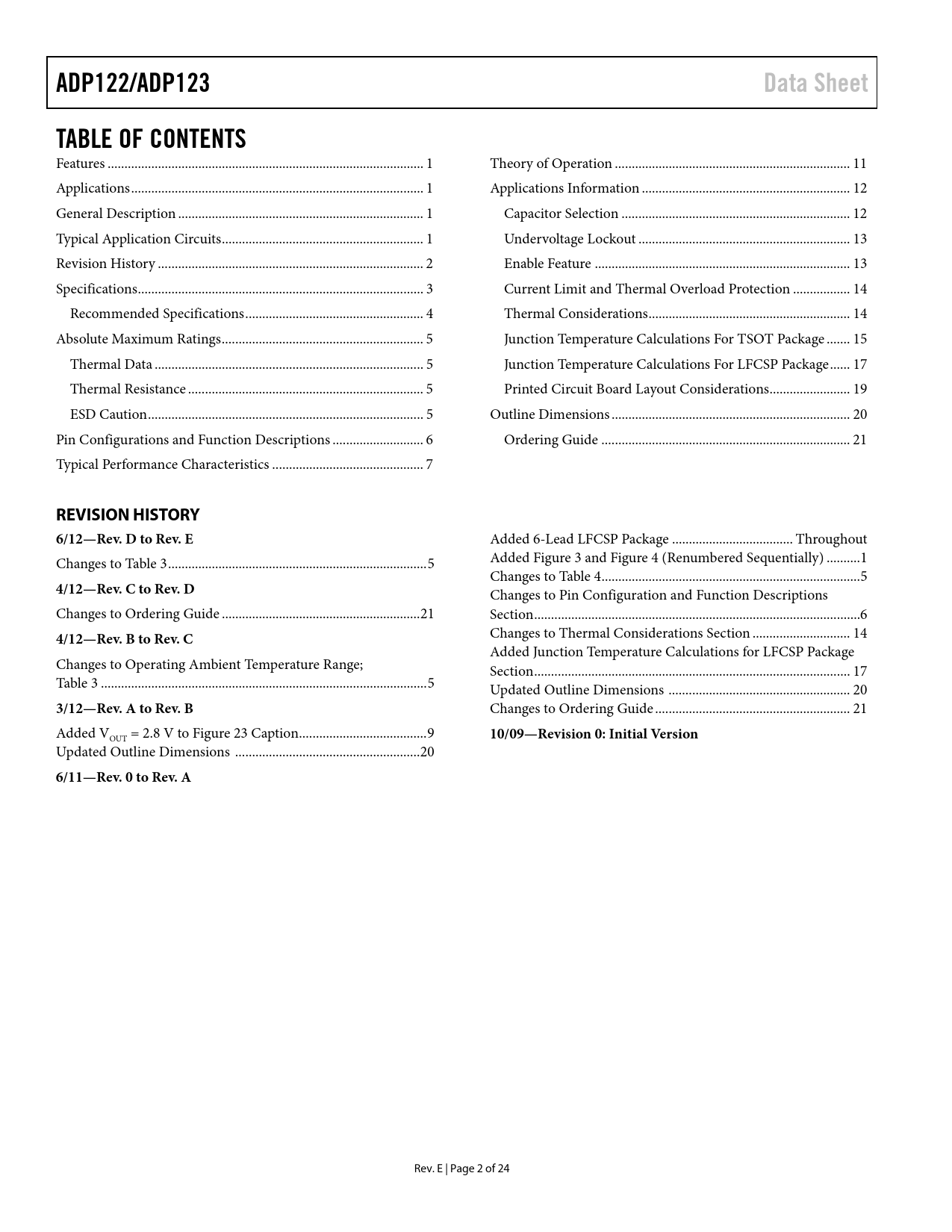 link to page 1 link to page 1 link to page 1 link to page 1 link to page 2 link to page 3 link to page 4 link to page 5 link to page 5 link to page 5 link to page 5 link to page 6 link to page 7 link to page 11 link to page 12 link to page 12 link to page 13 link to page 13 link to page 14 link to page 14 link to page 15 link to page 17 link to page 19 link to page 20 link to page 21 ADP122/ADP123Data SheetTABLE OF CONTENTS Features .. 1 Theory of Operation .. 11 Applications ... 1 Applications Information .. 12 General Description ... 1 Capacitor Selection .. 12 Typical Application Circuits .. 1 Undervoltage Lockout ... 13 Revision History ... 2 Enable Feature .. 13 Specifications ... 3 Current Limit and Thermal Overload Protection ... 14 Recommended Specifications ... 4 Thermal Considerations .. 14 Absolute Maximum Ratings .. 5 Junction Temperature Calculations For TSOT Package ... 15 Thermal Data .. 5 Junction Temperature Calculations For LFCSP Package .. 17 Thermal Resistance .. 5 Printed Circuit Board Layout Considerations.. 19 ESD Caution .. 5 Outline Dimensions ... 20 Pin Configurations and Function Descriptions ... 6 Ordering Guide .. 21 Typical Performance Characteristics ... 7 REVISION HISTORY 6/12—Rev. D to Rev. E Added 6-Lead LFCSP Package .. Throughout Changes to Table 3 ... 5 Added Figure 3 and Figure 4 (Renumbered Sequentially) .. 1 Changes to Table 4 ... 5 4/12—Rev. C to Rev. D Changes to Pin Configuration and Function Descriptions Changes to Ordering Guide ... 21 Section ... 6 4/12—Rev. B to Rev. C Changes to Thermal Considerations Section ... 14 Added Junction Temperature Calculations for LFCSP Package Changes to Operating Ambient Temperature Range; Section .. 17 Table 3 ... 5 Updated Outline Dimensions .. 20 3/12—Rev. A to Rev. B Changes to Ordering Guide .. 21 Added VOUT = 2.8 V to Figure 23 Caption.. 9 10/09—Revision 0: Initial Version Updated Outline Dimensions ... 20 6/11—Rev. 0 to Rev. A Rev. E | Page 2 of 24 Document Outline Features Applications General Description Typical Application Circuits Revision History Specifications Recommended Specifications Absolute Maximum Ratings Thermal Data Thermal Resistance ESD Caution Pin Configurations and Function Descriptions Typical Performance Characteristics Theory of Operation Applications Information Capacitor Selection Output Capacitor Input Bypass Capacitor Input and Output Capacitor Properties Undervoltage Lockout Enable Feature Current Limit and Thermal Overload Protection Thermal Considerations Junction Temperature Calculations For TSOT Package Junction Temperature Calculations For LFCSP Package Printed Circuit Board Layout Considerations Outline Dimensions Ordering Guide