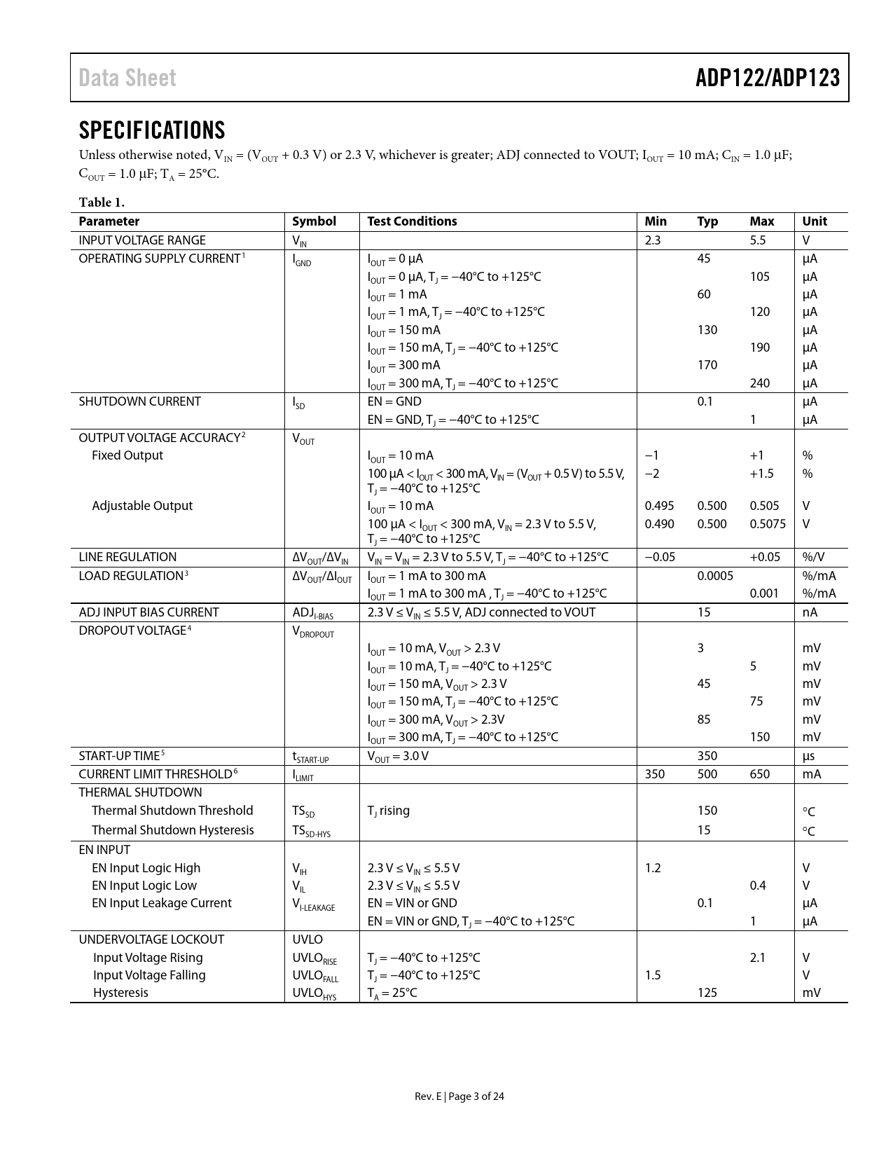 Data Sheet. ADP122/ADP123. SPECIFICATIONS. Table 1. Parameter. Symbol. Test Conditions. Min. Typ. Max. Unit