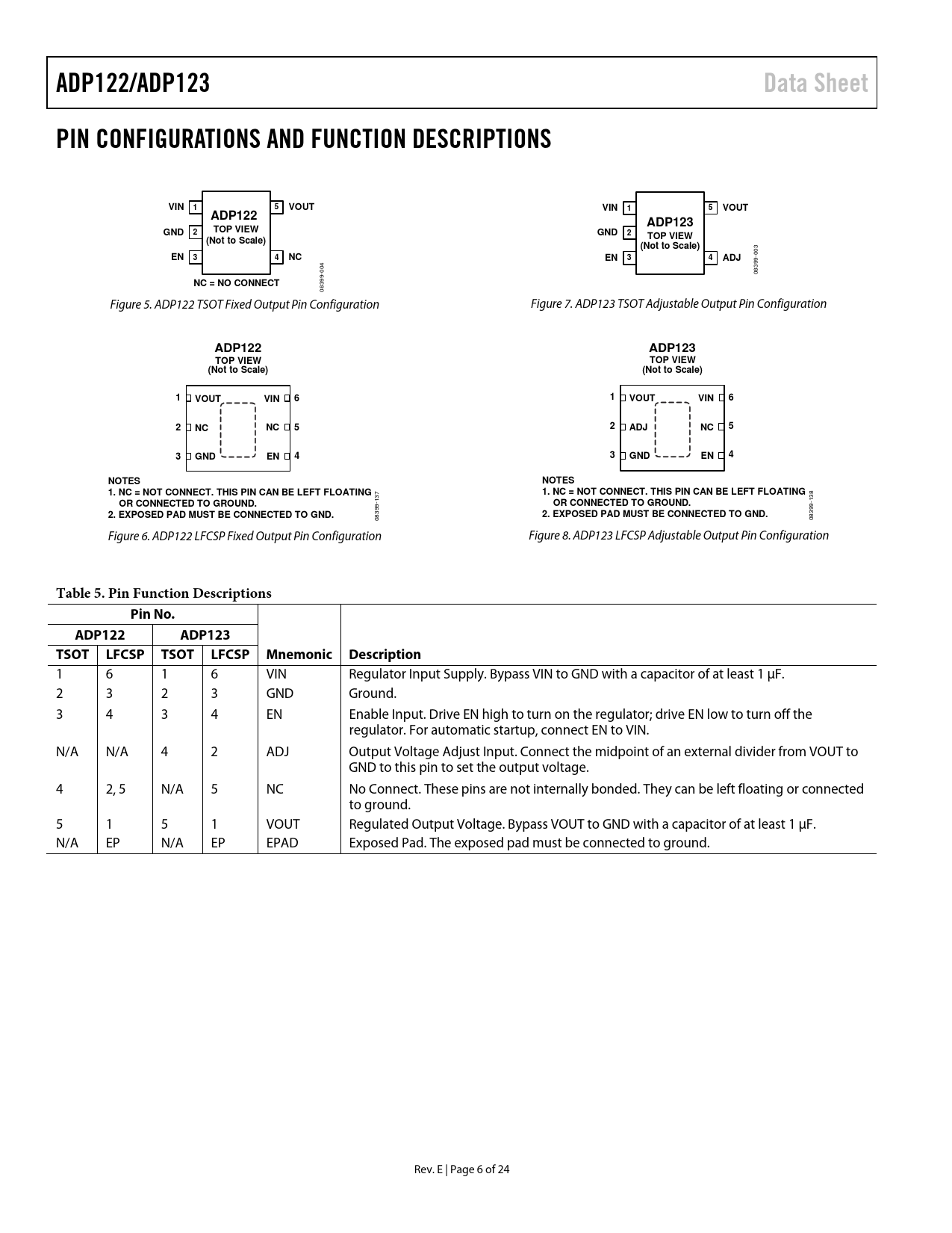ADP122/ADP123Data SheetPIN CONFIGURATIONS AND FUNCTION DESCRIPTIONSVIN15VOUTVIN15VOUTADP122ADP123TOP VIEWGND2GND2(Not to Scale)TOP VIEW(Not to Scale) 3 0 EN34NCEN34ADJ -0 9 9 3 004 8 0 NC = NO CONNECT 08399- Figure 5. ADP122 TSOT Fixed Output Pin Configuration Figure 7. ADP123 TSOT Adjustable Output Pin Configuration ADP122ADP123TOP VIEWTOP VIEW(Not to Scale)(Not to Scale)1VOUTVIN61VOUTVIN62NCNC52ADJNC53GNDEN43GNDEN4NOTESNOTES1. NC = NOT CONNECT. THIS PIN CAN BE LEFT FLOATING1. NC = NOT CONNECT. THIS PIN CAN BE LEFT FLOATING 137 138 OR CONNECTED TO GROUND.OR CONNECTED TO GROUND.2. EXPOSED PAD MUST BE CONNECTED TO GND.2. EXPOSED PAD MUST BE CONNECTED TO GND. 08399- 08399- Figure 6. ADP122 LFCSP Fixed Output Pin Configuration Figure 8. ADP123 LFCSP Adjustable Output Pin Configuration Table 5. Pin Function DescriptionsPin No.ADP122ADP123TSOT LFCSP TSOT LFCSP Mnemonic Description 1 6 1 6 VIN Regulator Input Supply. Bypass VIN to GND with a capacitor of at least 1 µF. 2 3 2 3 GND Ground. 3 4 3 4 EN Enable Input. Drive EN high to turn on the regulator; drive EN low to turn off the regulator. For automatic startup, connect EN to VIN. N/A N/A 4 2 ADJ Output Voltage Adjust Input. Connect the midpoint of an external divider from VOUT to GND to this pin to set the output voltage. 4 2, 5 N/A 5 NC No Connect. These pins are not internally bonded. They can be left floating or connected to ground. 5 1 5 1 VOUT Regulated Output Voltage. Bypass VOUT to GND with a capacitor of at least 1 µF. N/A EP N/A EP EPAD Exposed Pad. The exposed pad must be connected to ground. Rev. E | Page 6 of 24 Document Outline Features Applications General Description Typical Application Circuits Revision History Specifications Recommended Specifications Absolute Maximum Ratings Thermal Data Thermal Resistance ESD Caution Pin Configurations and Function Descriptions Typical Performance Characteristics Theory of Operation Applications Information Capacitor Selection Output Capacitor Input Bypass Capacitor Input and Output Capacitor Properties Undervoltage Lockout Enable Feature Current Limit and Thermal Overload Protection Thermal Considerations Junction Temperature Calculations For TSOT Package Junction Temperature Calculations For LFCSP Package Printed Circuit Board Layout Considerations Outline Dimensions Ordering Guide