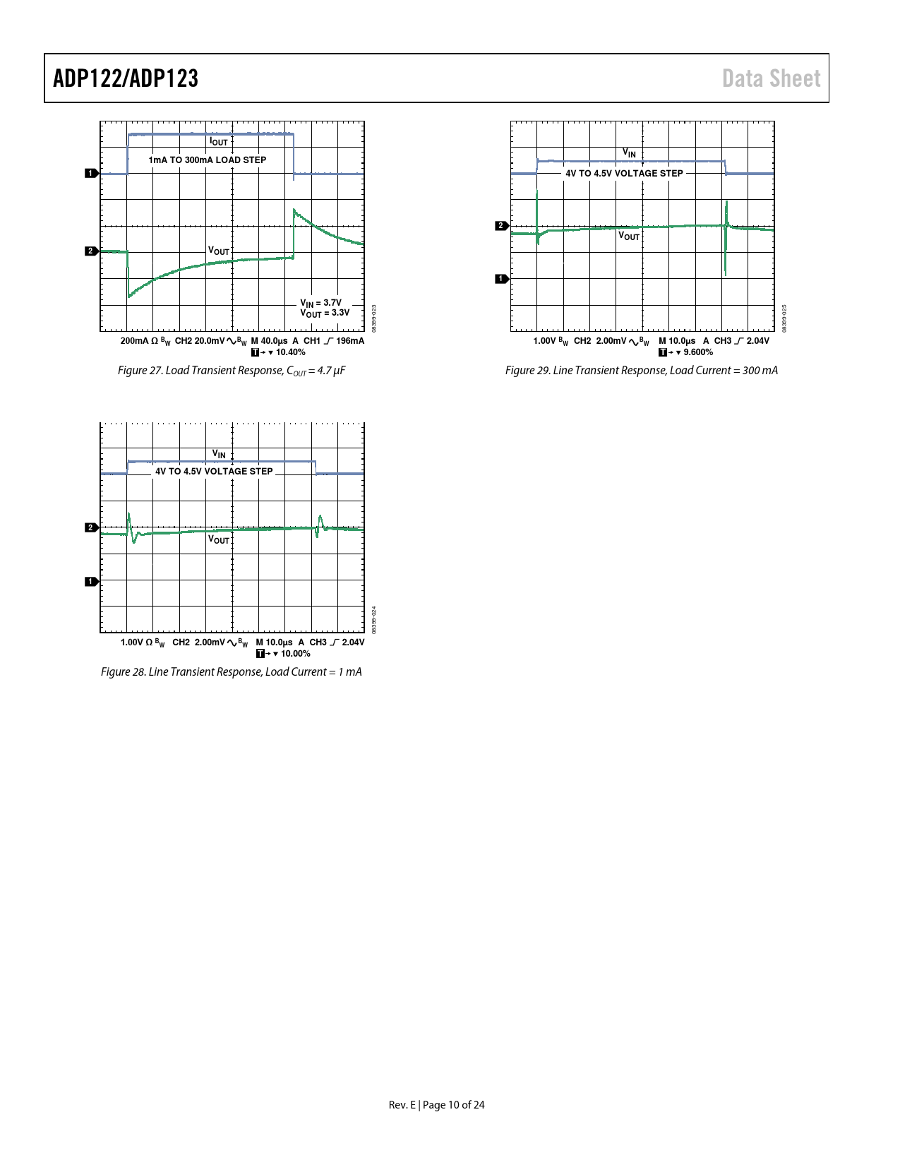 | Pages / Page | 24 / 10 — ADP122/ADP123. Data Sheet. IOUT. VIN. 1mA TO 300mA LOAD STEP. 4V TO 4.5V … |