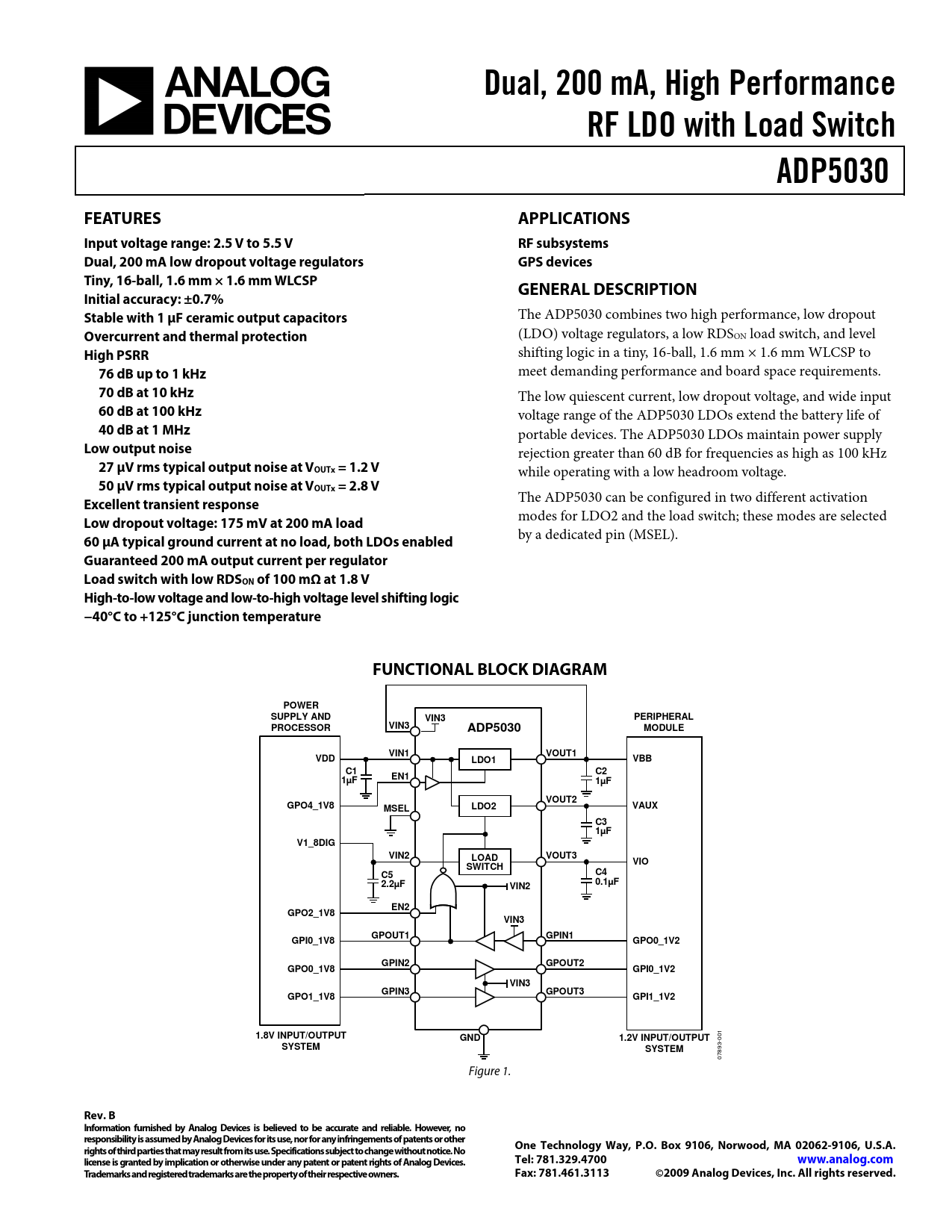 Dual, 200 mA, High Performance RF LDO with Load Switch ADP5030 FEATURES APPLICATIONS Input voltage range: 2.5 V to 5.5 V RF subsystems Dual, 200 mA low dropout voltage regulators GPS devices Tiny, 16-ball, 1.6 mm × 1.6 mm WLCSP GENERAL DESCRIPTION Initial accuracy: ±0.7% Stable with 1 μF ceramic output capacitors