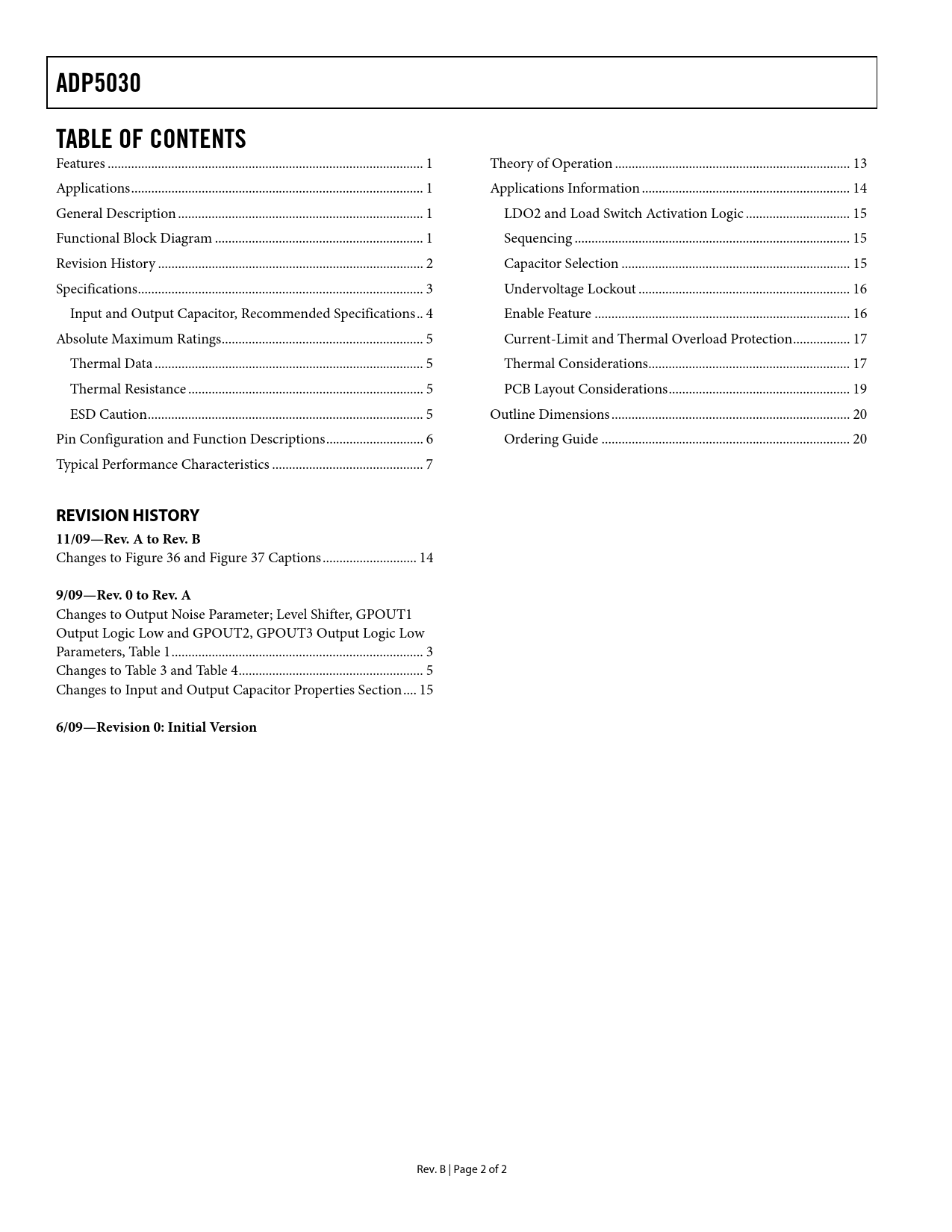 link to page 1 link to page 1 link to page 1 link to page 1 link to page 2 link to page 3 link to page 4 link to page 5 link to page 5 link to page 5 link to page 5 link to page 6 link to page 7 link to page 13 link to page 14 link to page 15 link to page 15 link to page 15 link to page 16 link to page 16 link to page 17 link to page 17 link to page 19 link to page 20 link to page 20 ADP5030TABLE OF CONTENTS Features .. 1 Theory of Operation .. 13 Applications ... 1 Applications Information .. 14 General Description ... 1 LDO2 and Load Switch Activation Logic ... 15 Functional Block Diagram .. 1 Sequencing .. 15 Revision History ... 2 Capacitor Selection .. 15 Specifications ... 3 Undervoltage Lockout ... 16 Input and Output Capacitor, Recommended Specifications .. 4 Enable Feature .. 16 Absolute Maximum Ratings .. 5 Current-Limit and Thermal Overload Protection ... 17 Thermal Data .. 5 Thermal Considerations .. 17 Thermal Resistance .. 5 PCB Layout Considerations .. 19 ESD Caution .. 5 Outline Dimensions ... 20 Pin Configuration and Function Descriptions ... 6 Ordering Guide .. 20 Typical Performance Characteristics ... 7 REVISION HISTORY11/09—Rev. A to Rev. B Changes to Figure 36 and Figure 37 Captions .. 14 9/09—Rev. 0 to Rev. A Changes to Output Noise Parameter; Level Shifter, GPOUT1 Output Logic Low and GPOUT2, GPOUT3 Output Logic Low Parameters, Table 1 ... 3 Changes to Table 3 and Table 4 ... 5 Changes to Input and Output Capacitor Properties Section .. 15 6/09—Revision 0: Initial Version Rev. B | Page 2 of 2 Document Outline FEATURES APPLICATIONS GENERAL DESCRIPTION FUNCTIONAL BLOCK DIAGRAM TABLE OF CONTENTS REVISION HISTORY SPECIFICATIONS INPUT AND OUTPUT CAPACITOR, RECOMMENDED SPECIFICATIONS ABSOLUTE MAXIMUM RATINGS THERMAL DATA THERMAL RESISTANCE ESD CAUTION PIN CONFIGURATION AND FUNCTION DESCRIPTIONS TYPICAL PERFORMANCE CHARACTERISTICS THEORY OF OPERATION APPLICATIONS INFORMATION LDO2 AND LOAD SWITCH ACTIVATION LOGIC SEQUENCING CAPACITOR SELECTION Output Capacitor Input Bypass Capacitor Input and Output Capacitor Properties UNDERVOLTAGE LOCKOUT ENABLE FEATURE CURRENT-LIMIT AND THERMAL OVERLOAD PROTECTION THERMAL CONSIDERATIONS PCB LAYOUT CONSIDERATIONS OUTLINE DIMENSIONS ORDERING GUIDE