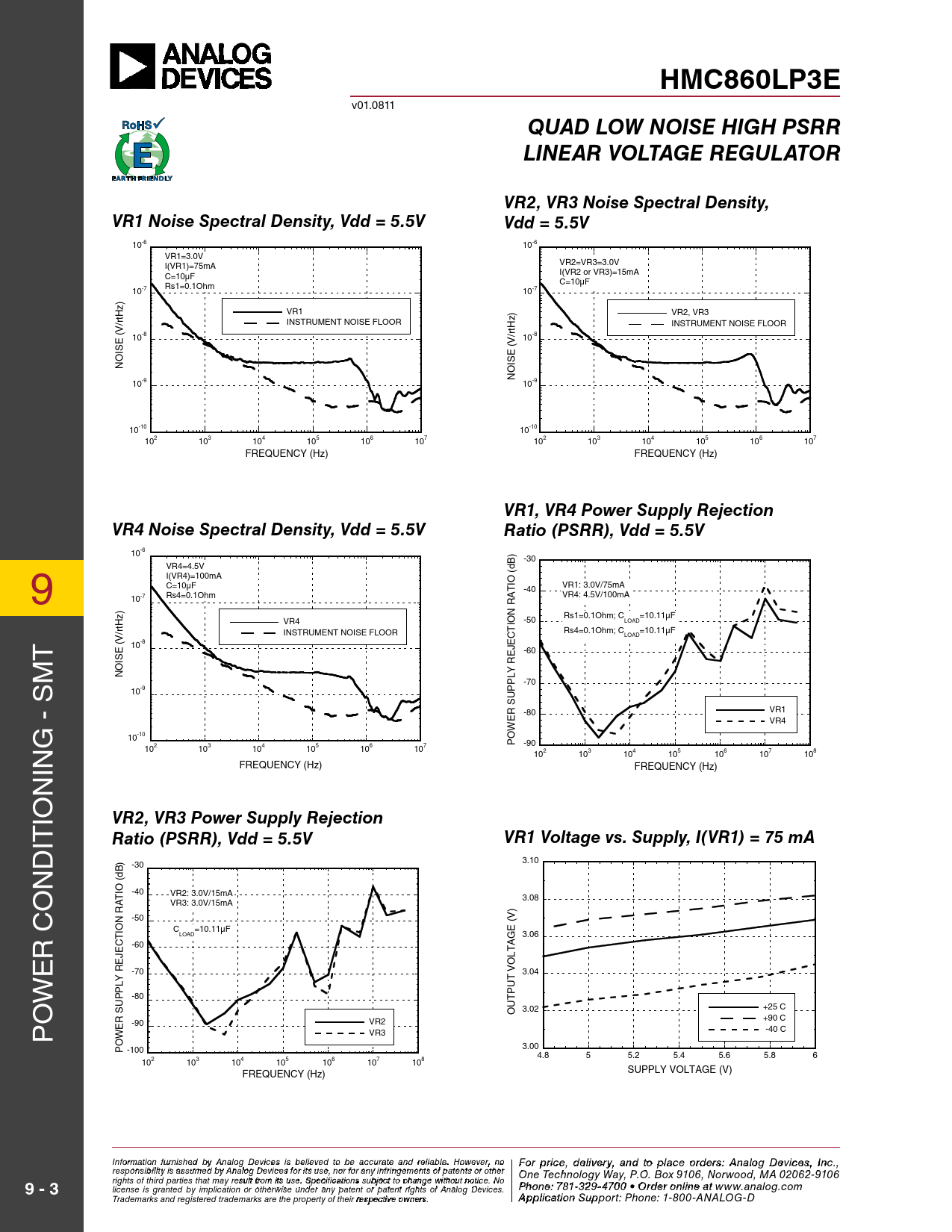 HMC860LP3E v01.0811 QUAD LOW NOISE HIGH PSRRLINEAR VOLTAGE REGULATORVR2, VR3 Noise Spectral Density,VR1 Noise Spectral Density, Vdd = 5.5VVdd = 5.5V 10-6 10-6 VR1=3.0V I(VR1)=75mA VR2=VR3=3.0V C=10μF I(VR2 or VR3)=15mA Rs1=0.1Ohm C=10μF 10-7 10-7 VR1 VR2, VR3 z) INSTRUMENT NOISE FLOOR INSTRUMENT NOISE FLOOR (V/rtHz) 10-8 /rtH 10-8 (V E S NOISE OI N 10-9 10-9 10-10 10-10 102 103 104 105 106 107 102 103 104 105 106 107 FREQUENCY (Hz) FREQUENCY (Hz) VR1, VR4 Power Supply RejectionVR4 Noise Spectral Density, Vdd = 5.5VRatio (PSRR), Vdd = 5.5V 10-6 ) -30 9 VR4=4.5V I(VR4)=100mA (dB C=10μF IO T -40 VR1: 3.0V/75mA 10-7 Rs4=0.1Ohm A VR4: 4.5V/100mA R N Rs1=0.1Ohm; C =10.11μF VR4 -50 IO LOAD T INSTRUMENT NOISE FLOOR Rs4=0.1Ohm; C =10.11μF T C LOAD (V/rtHz) 10-8 JE -60 E M R NOISE LY P -70 10-9 P U S R -80 VR1 E VR4 G - S W 10-10 O P -90 102 103 104 105 106 107 IN 102 103 104 105 106 107 108 FREQUENCY (Hz) FREQUENCY (Hz) N IO VR2, VR3 Power Supply Rejection IT Ratio (PSRR), Vdd = 5.5VVR1 Voltage vs. Supply, I(VR1) = 75 mA D ) 3.10 N -30 (dB O IO -40 T VR2: 3.0V/15mA A 3.08 VR3: 3.0V/15mA R ) -50 N (V IO C =10.11μF E R C T LOAD G 3.06 C -60 A E JE LT E O R -70 V 3.04 T W LY P U P P -80 T O U U S 3.02 +25 C O P R +90 C -90 VR2 E VR3 -40 C W O P -100 3.004.8 5 5.2 5.4 5.6 5.8 6 102 103 104 105 106 107 108 FREQUENCY (Hz) SUPPLY VOLTAGE (V) Inf F or o m ra tip o r n ifc ur e n ,is hd e e d lbiv y e A r n y al oa g n D d evi tco e s p is la beclie ev eo d rtd o ebre sa: H ccur iattti e taen M d re ilicarbloew . H a o ve wev eC r, o n r o For price, delivery, and to place orders: Analog Devices, Inc., responsibility is assumed by Analog Devices for its use, nor for any infringements of patents or other poration, 2 Elizabeth Drive, Chelmsford, MA 01824 One Technology Way, P.O. Box 9106, Norwood, MA 02062-9106 9 - 3 978-250-3343 tel • 978-250-3373 fax • O rights of third parties that may result from its use. Specifications subject to change without notice. No rd P e h r o nO e n : 7 -li 81 n - e 32 a 9- t 4 w 70 ww. 0 • Ohi rd tt e ite r on.lc inom license is granted by implication or otherwise under any patent or patent rights of Analog Devices. e at www.analog.com Application Trademarks and registered trademarks are the property of their respective owners.Support: apps@ A h ppitlitcitae ti .oco n Sm upport: Phone: 1-800-ANALOG-D