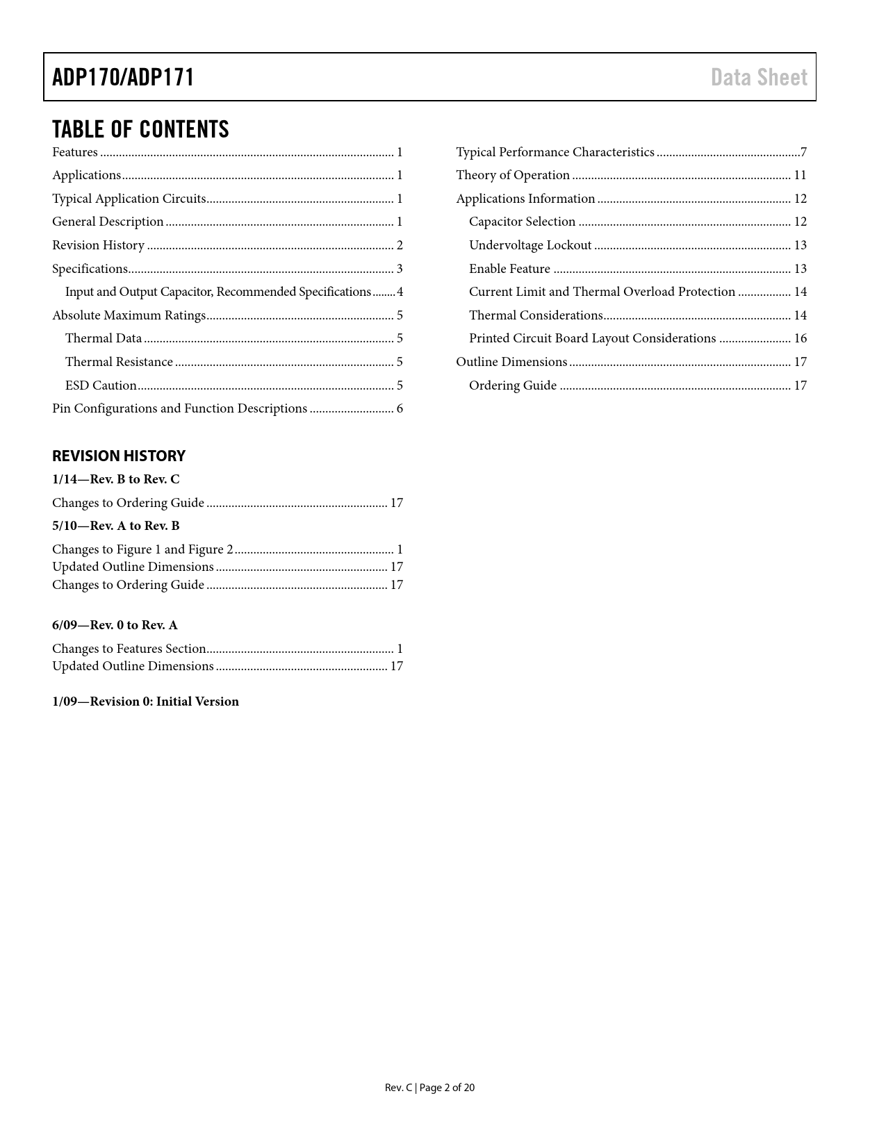 link to page 1 link to page 1 link to page 1 link to page 1 link to page 2 link to page 3 link to page 4 link to page 5 link to page 5 link to page 5 link to page 5 link to page 6 link to page 7 link to page 11 link to page 12 link to page 12 link to page 13 link to page 13 link to page 14 link to page 14 link to page 16 link to page 17 link to page 17 ADP170/ADP171Data SheetTABLE OF CONTENTS Features .. 1 Typical Performance Characteristics ..7 Applications ... 1 Theory of Operation .. 11 Typical Application Circuits .. 1 Applications Information .. 12 General Description ... 1 Capacitor Selection .. 12 Revision History ... 2 Undervoltage Lockout ... 13 Specifications ... 3 Enable Feature .. 13 Input and Output Capacitor, Recommended Specifications .. 4 Current Limit and Thermal Overload Protection ... 14 Absolute Maximum Ratings .. 5 Thermal Considerations .. 14 Thermal Data .. 5 Printed Circuit Board Layout Considerations ... 16 Thermal Resistance .. 5 Outline Dimensions ... 17 ESD Caution .. 5 Ordering Guide .. 17 Pin Configurations and Function Descriptions ... 6 REVISION HISTORY 1/14—Rev. B to Rev. C Changes to Ordering Guide .. 17 5/10—Rev. A to Rev. B Changes to Figure 1 and Figure 2 ... 1 Updated Outline Dimensions ... 17 Changes to Ordering Guide .. 17 6/09—Rev. 0 to Rev. A Changes to Features Section.. 1 Updated Outline Dimensions ... 17 1/09—Revision 0: Initial Version Rev. C | Page 2 of 20 Document Outline Features Applications Typical Application Circuits General Description Table of Contents Revision History Specifications Input and Output Capacitor, Recommended Specifications Absolute Maximum Ratings Thermal Data Thermal Resistance ESD Caution Pin Configurations and Function Descriptions Typical Performance Characteristics Theory of Operation Applications Information Capacitor Selection Output Capacitor Input Bypass Capacitor Input and Output Capacitor Properties Undervoltage Lockout Enable Feature Current Limit and Thermal Overload Protection Thermal Considerations Printed Circuit Board Layout Considerations Outline Dimensions Ordering Guide