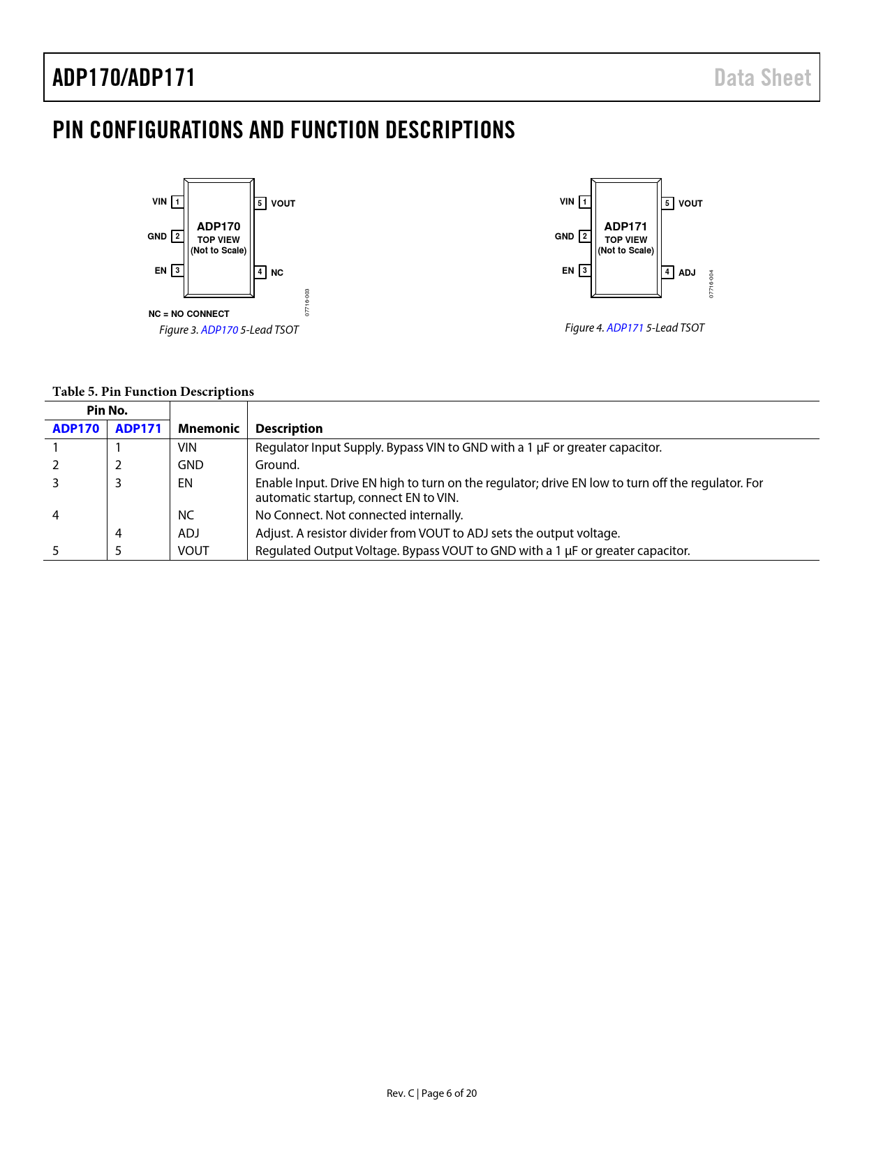 Pages / Page20 / 6 — ADP170/ADP171. Data Sheet. PIN CONFIGURATIONS AND FUNCTION DESCRIPTIONS. …