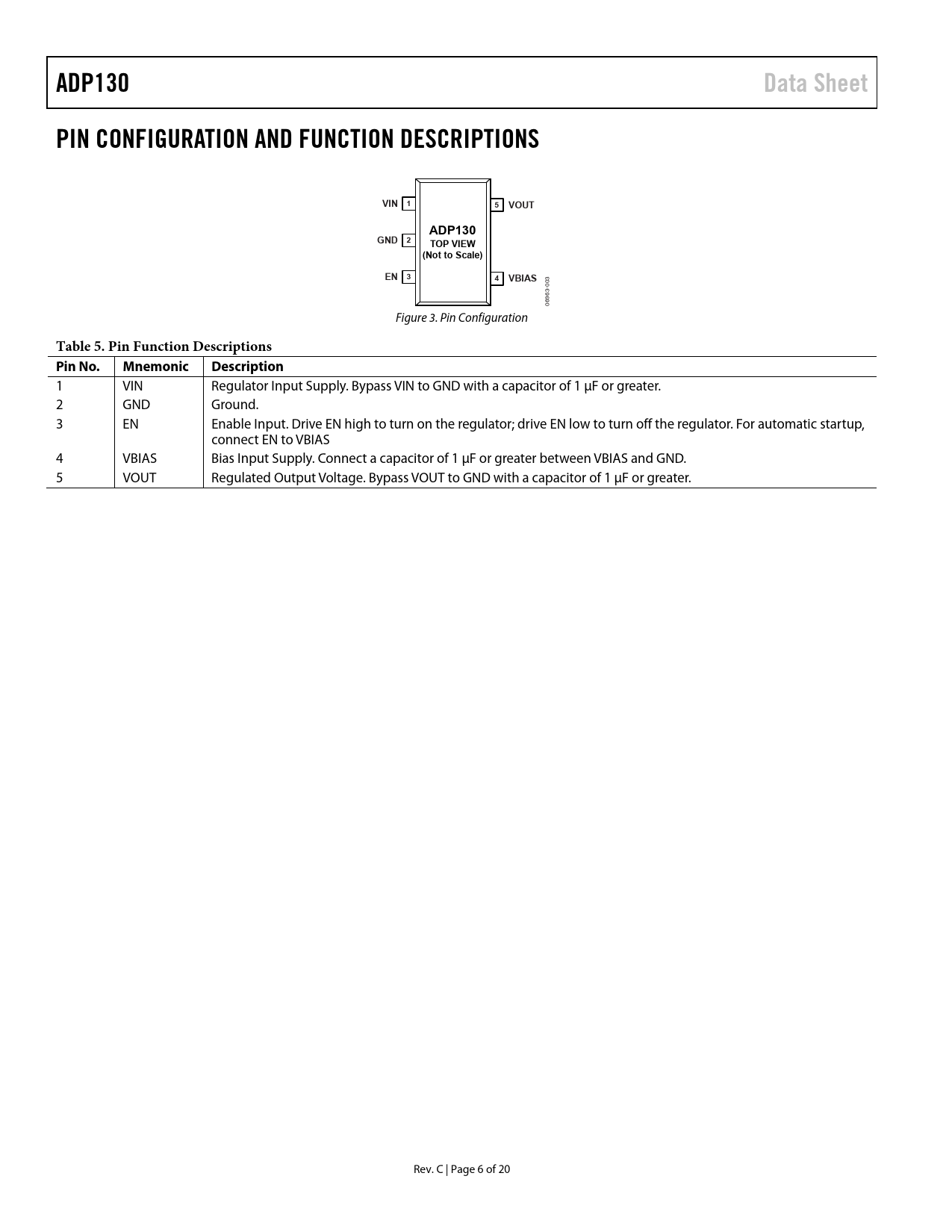 Pages / Page20 / 6 — ADP130. Data Sheet. PIN CONFIGURATION AND FUNCTION DESCRIPTIONS. VIN 1. …