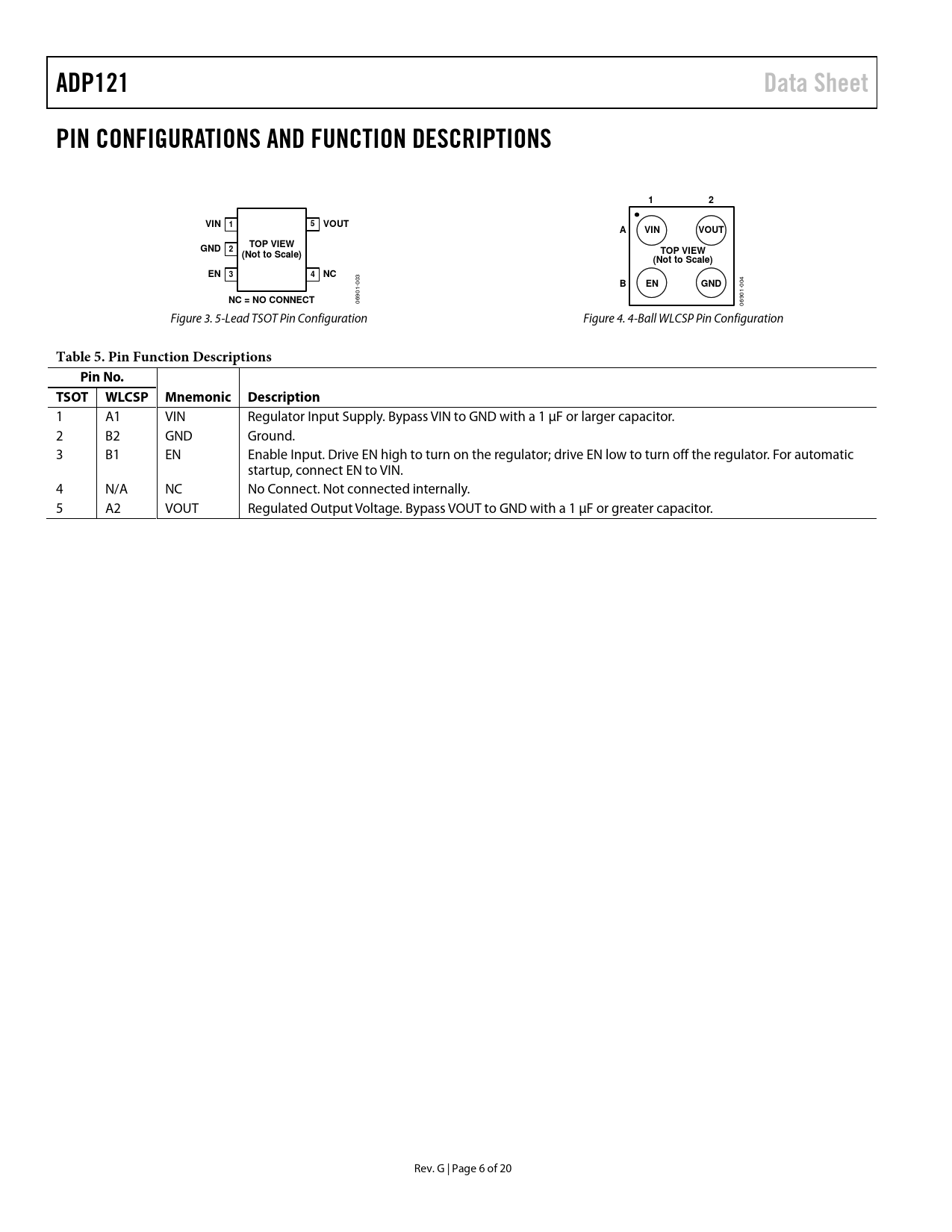 Pages / Page20 / 6 — ADP121. Data Sheet. PIN CONFIGURATIONS AND FUNCTION DESCRIPTIONS. VIN 1. …