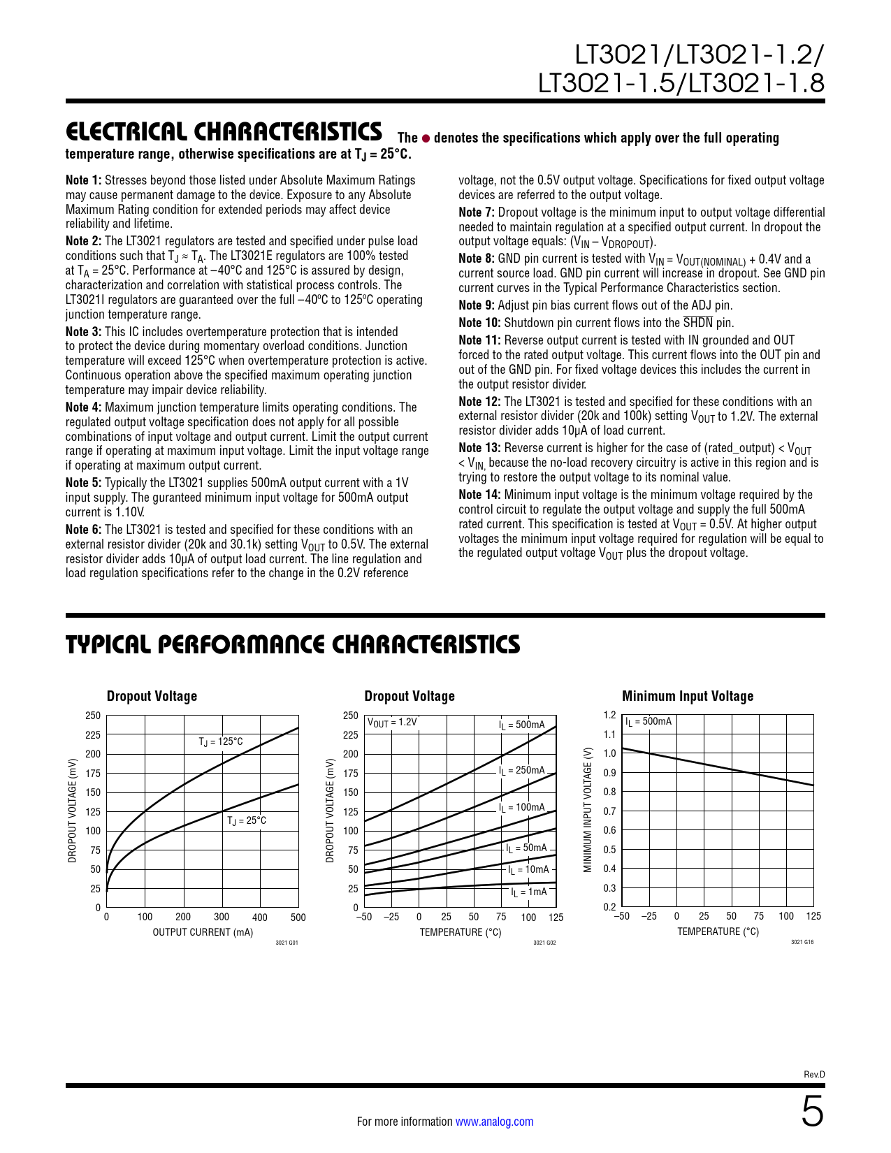 250 250 1.2 VOUT = 1.2V I I L = 500mA L = 500mA 225 225 1.1 TJ = 125°C 200 200 1.0 175 175 IL = 250mA 0.9 TAGE (V) 150 150 0.8 TAGE (mV) TAGE (mV) 125 125 IL = 100mA 0.7 TJ = 25°C 100 100 0.6 75 75 IL = 50mA 0.5 DROPOUT VOL DROPOUT VOL 50 50 IL = 10mA MINIMUM INPUT VOL 0.4 25 25 I 0.3 L = 1mA 0 0 0.2 0 100 200 300 400 500 –50 –25 0 25 50 75 100 125 –50 –25 0 25 50 75 100 125 OUTPUT CURRENT (mA) TEMPERATURE (°C) TEMPERATURE (°C) 3021 G01 3021 G02 3021 G16 Rev.D For more information www.analog.com 5 Document Outline Features Description Applications Typical Application Absolute Maximum Ratings Typical Performance Characteristics Pin Functions Applications Information Package Description