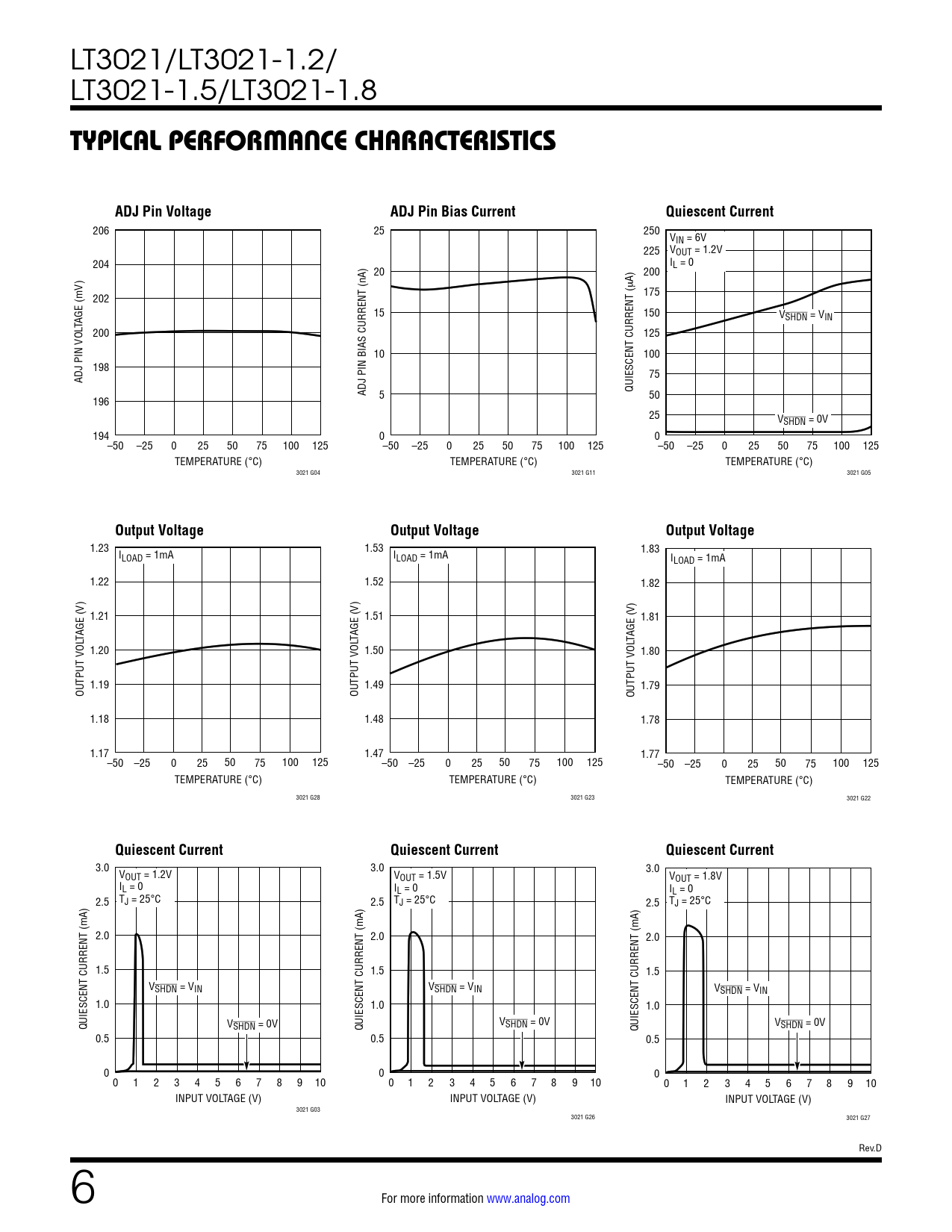 206 25 250 VIN = 6V 225 VOUT = 1.2V 204 I 20 200 L = 0 A) μ 175 202 15 150 V TAGE (mV) SHDN = VIN 200 125 10 100 198 ADJ PIN VOL 75 ADJ PIN BIAS CURRENT (nA) 5 QUIESCENT CURRENT ( 50 196 25 VSHDN = 0V 194 0 0 –50 –25 0 25 50 75 100 125 –50 –25 0 25 50 75 100 125 –50 –25 0 25 50 75 100 125 TEMPERATURE (°C) TEMPERATURE (°C) TEMPERATURE (°C) 3021 G04 3021 G11 3021 G05